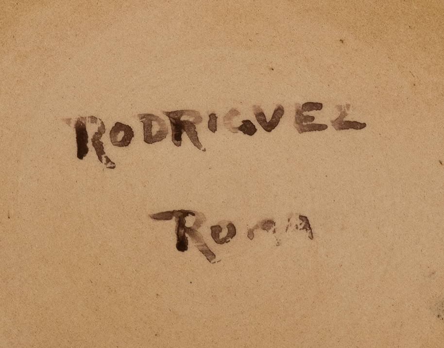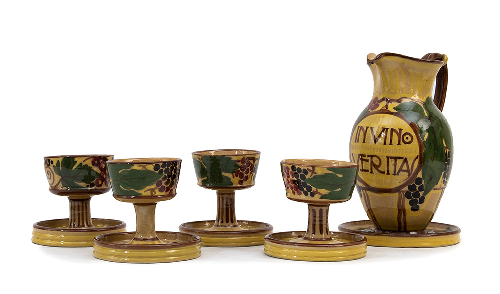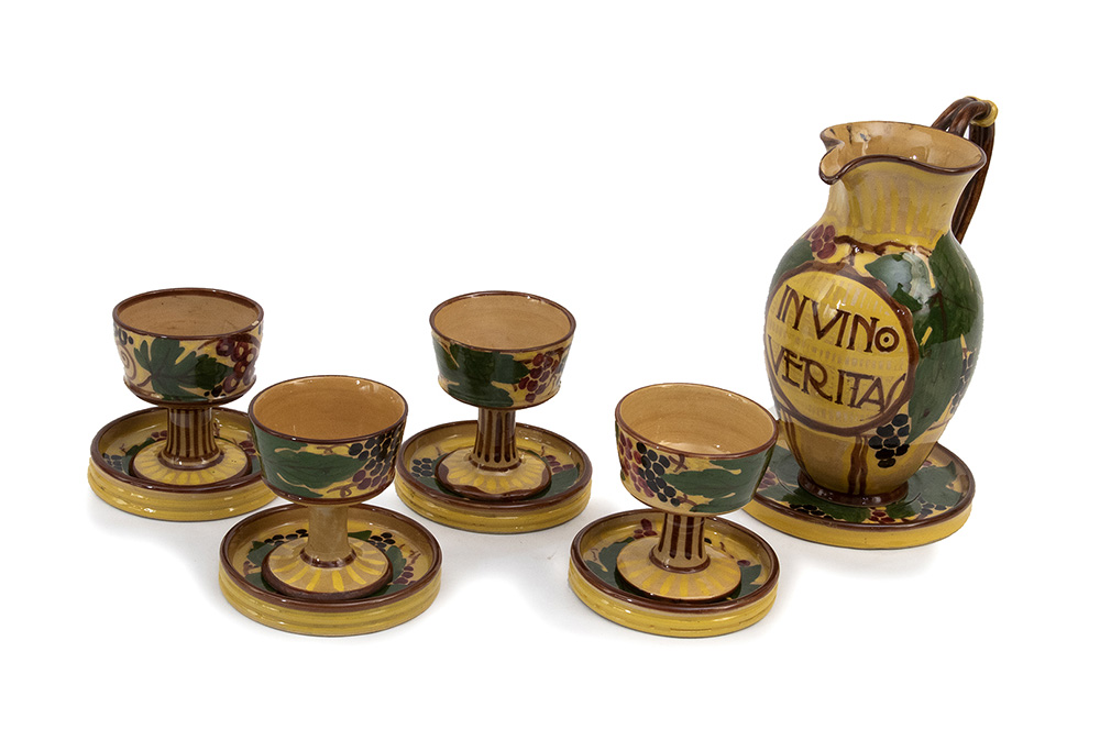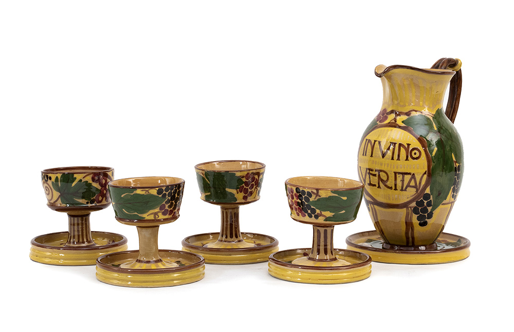 RODRIGUEZ - ROMA Servizio da vino composto da 10 pezzi decorato a tralci d’uva: una brocca con piattino, quattro calici, quattro piattini Ceramica dipinta, brocca, h. 23,5 cm; piattino, 16 cm; calici, 11 x 9 cm; piattini, d. 12,5 cm Firma sotto la base: Rodriguez Roma