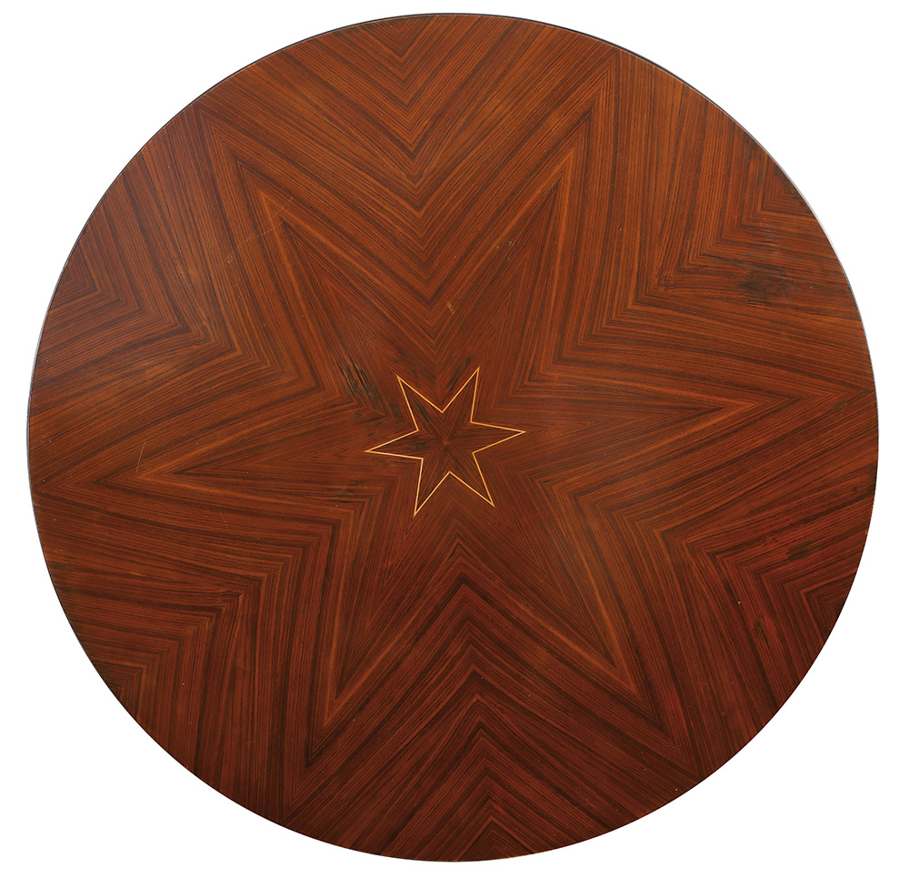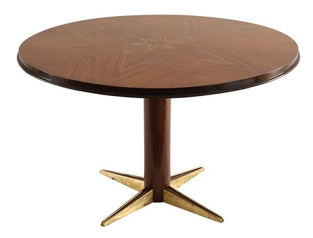 PAOLO BUFFA (attr.) Tavolo da pranzo circolare con base in legno e ottone lucidato, gambe e piano impiallacciato in palissandro con intarsio a stella al centro, Anni ‘60 Palissandro e ottone, 80 x 128 cm CONDITION REPORT Lievi difetti sul piano