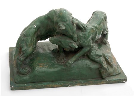 ANGIOLO VANNETTI Lotta di lupi Scultura in gesso patinato, 31 x 52 x 28 cm PUBBLICAZIONI ED ESPOSIZIONI “Nel segno della tradizione. Pittori e scultore in Italia, 1900-1950”, 2002, n° 20 Autentica su foto, Roma, 2007