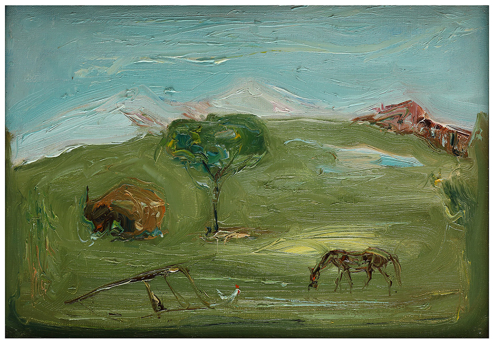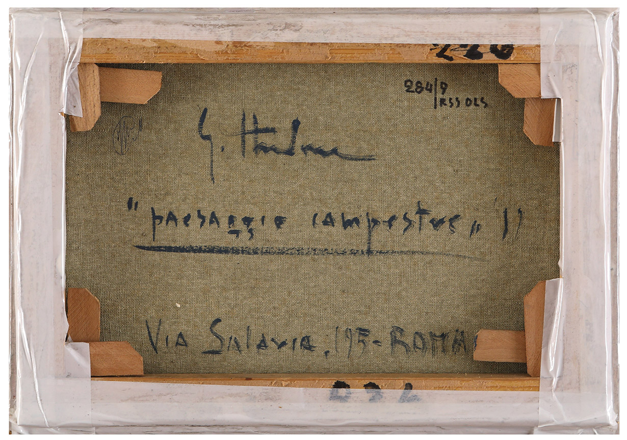 GIOVANNI STRADONE Paesaggio campestre, 1932 Olio su tela, 53 x 42 cm Firma, titolo, luogo e n° d’archivio al retro: G. Stradone, Paesaggio campestre, 32, Via Salarian 195 - Roma, 248/9