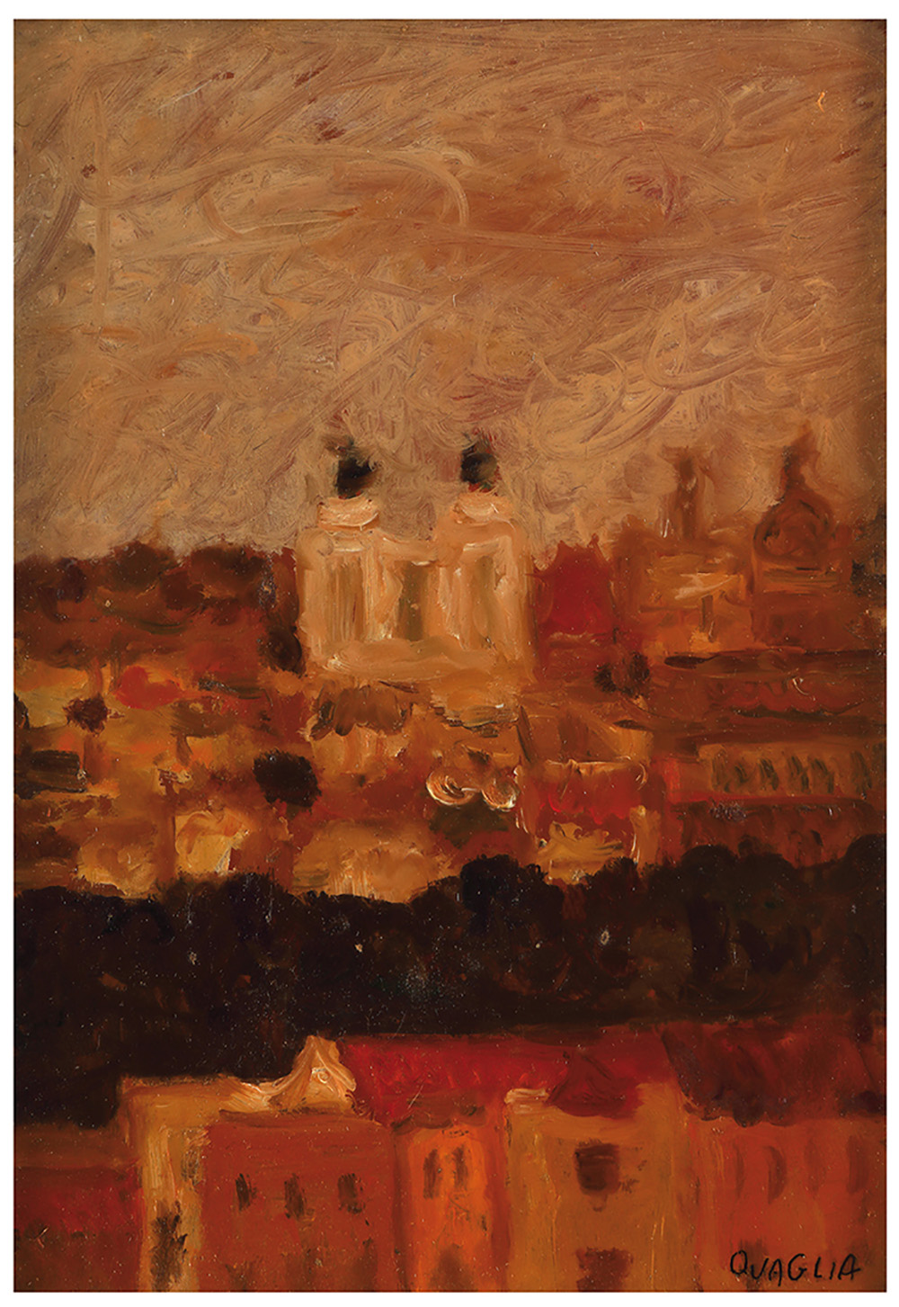 CARLO QUAGLIA Veduta romana Olio su tavoletta intelata, 35 x 25 cm Firma in basso a destra: Quaglia Autentica al retro della moglie Costanza Quaglia