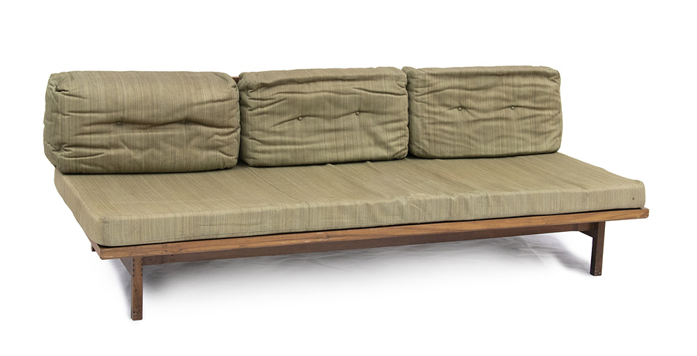 GIANFRANCO FRATTINI - CASSINA Divano tre posti con struttura in legno di noce e tessuto d’epoca color verde, 1956 Legno di noce e stoffa, 65 x 190 x 80 cm