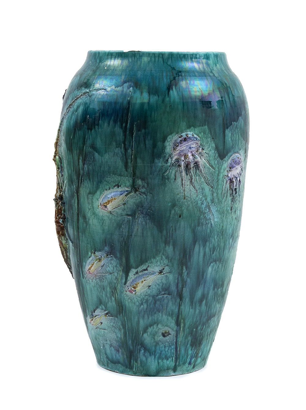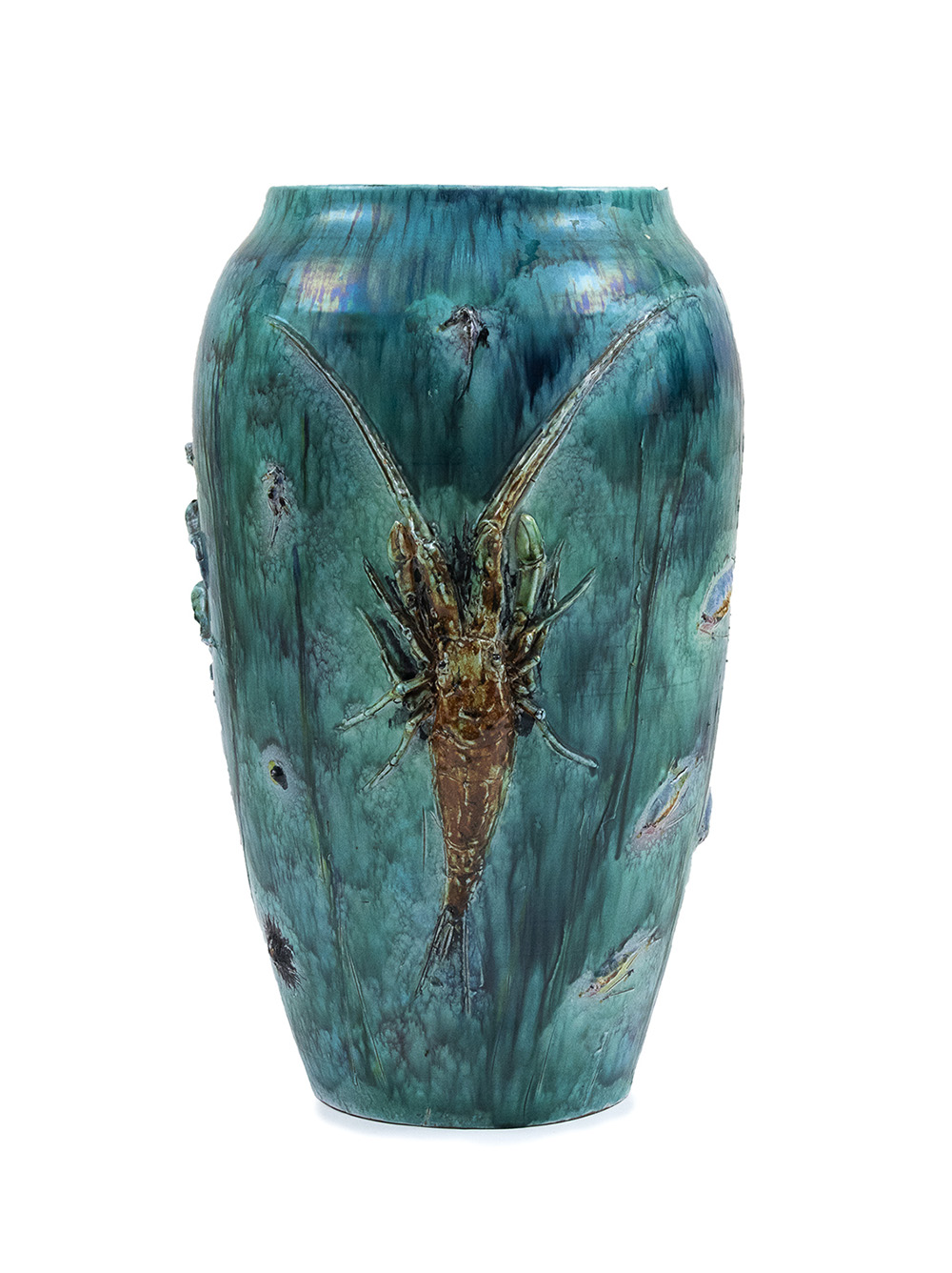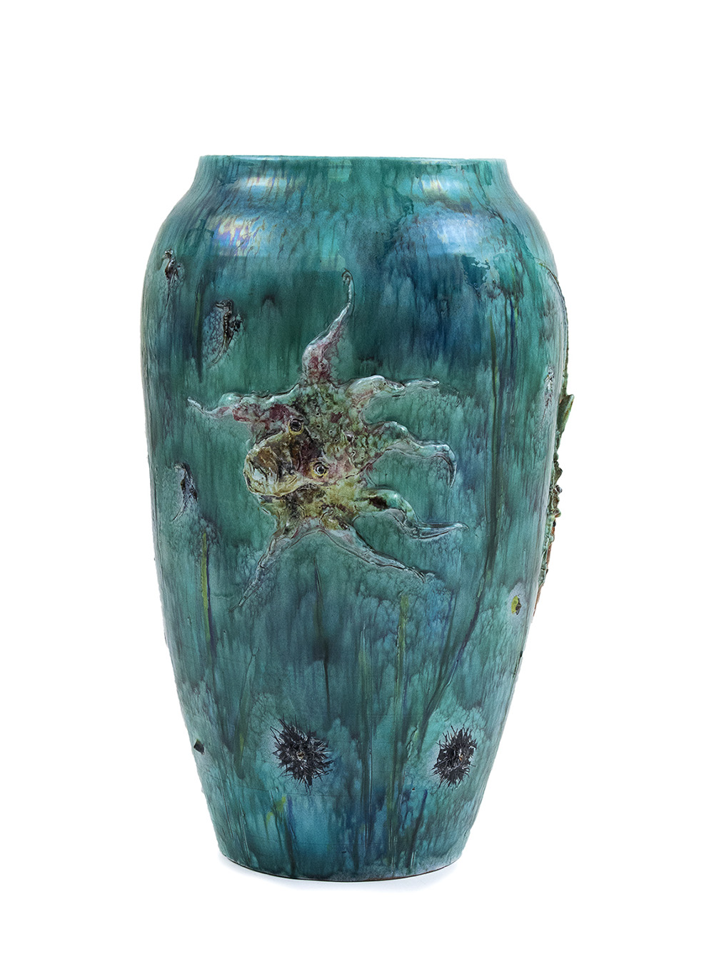 CERAMICA ALBISSOLA Grande vaso policromo con bassorilievi rappresentanti un aragosta, dei polipi e dei pesci, Anni ‘50 Ceramica dipinta, h. 72 cm