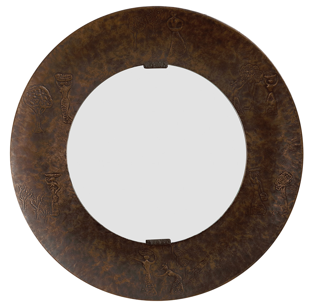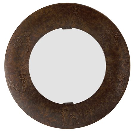 ANGELO BRAGALINI Specchiera su supporto in rame con figure stilizzate sbalzate Vetro e rame, d. 78 cm Firma in basso a destra: Bragalini