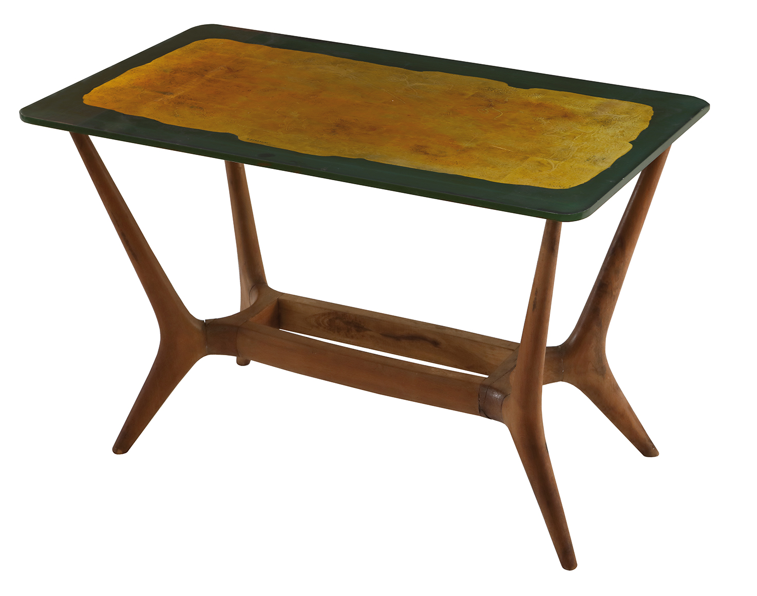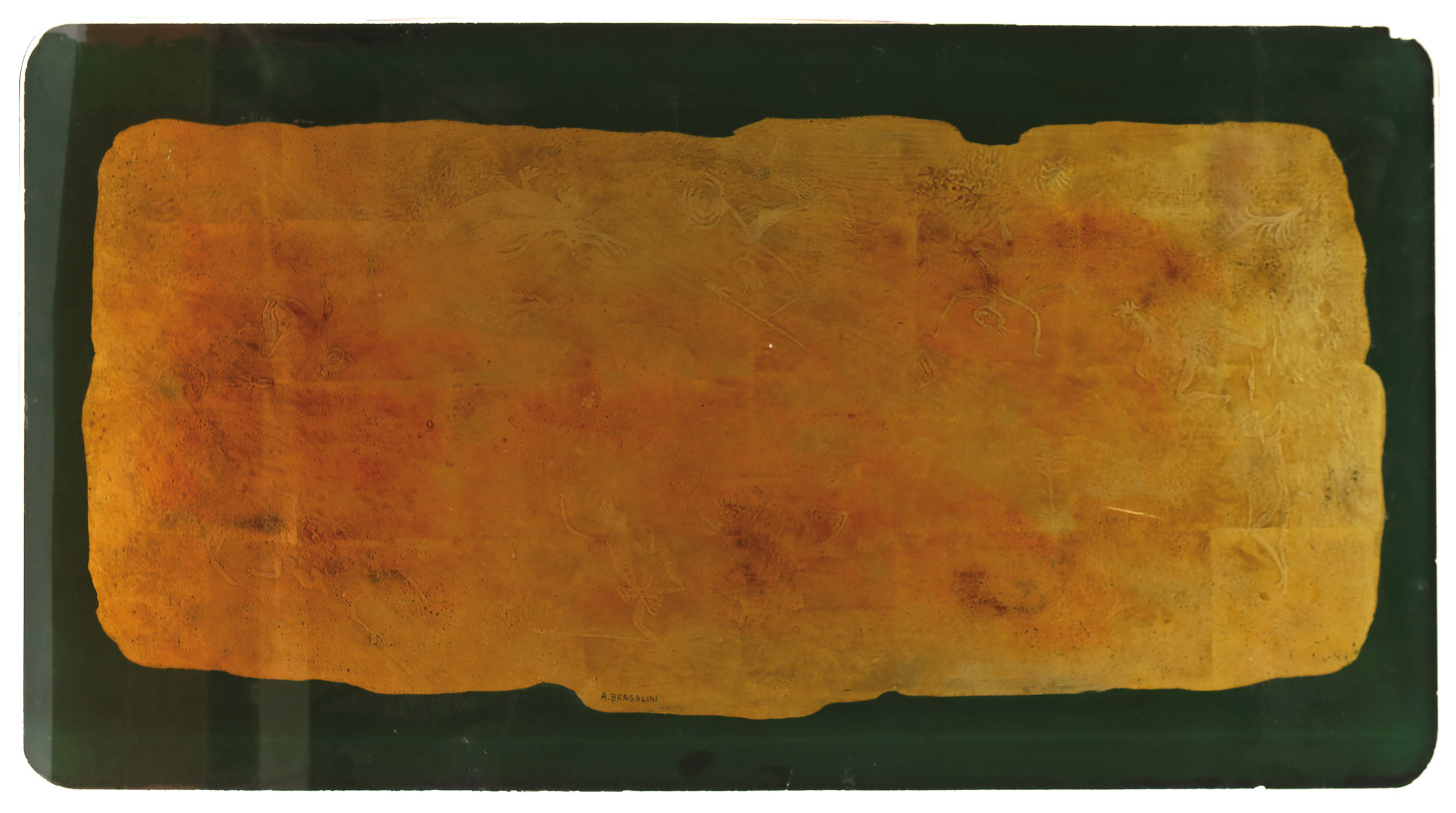ANGELO BRAGALINI Tavolo con piano in cristallo e figurazioni su foglia d’oro...
