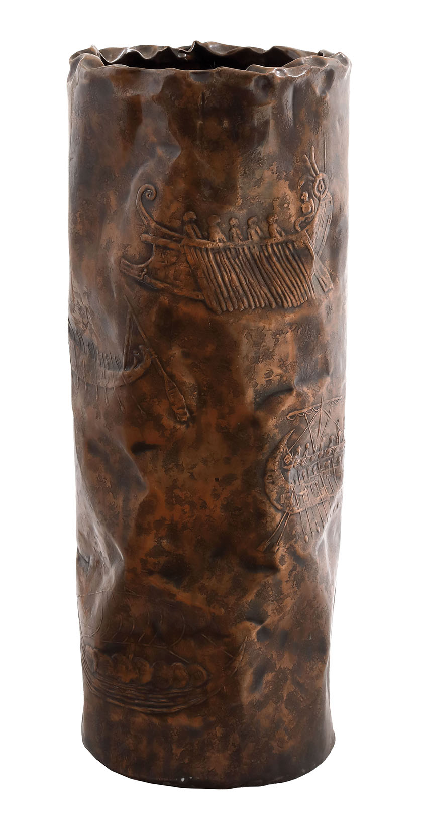 ANGELO BRAGALINI Vaso con figure stilizzate sbalzate Rame, h. 56,5 cm Firma...