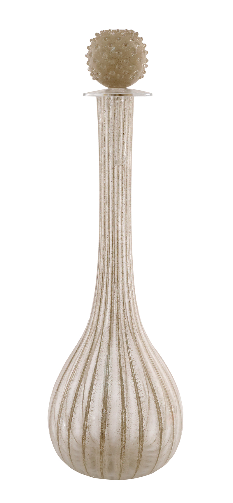 ERMANNO TOSO - MURANO Grande bottiglia con inclusioni a strisce argentate e tappo rostrato, 1936 Vetro, 87 x 29 cm