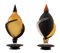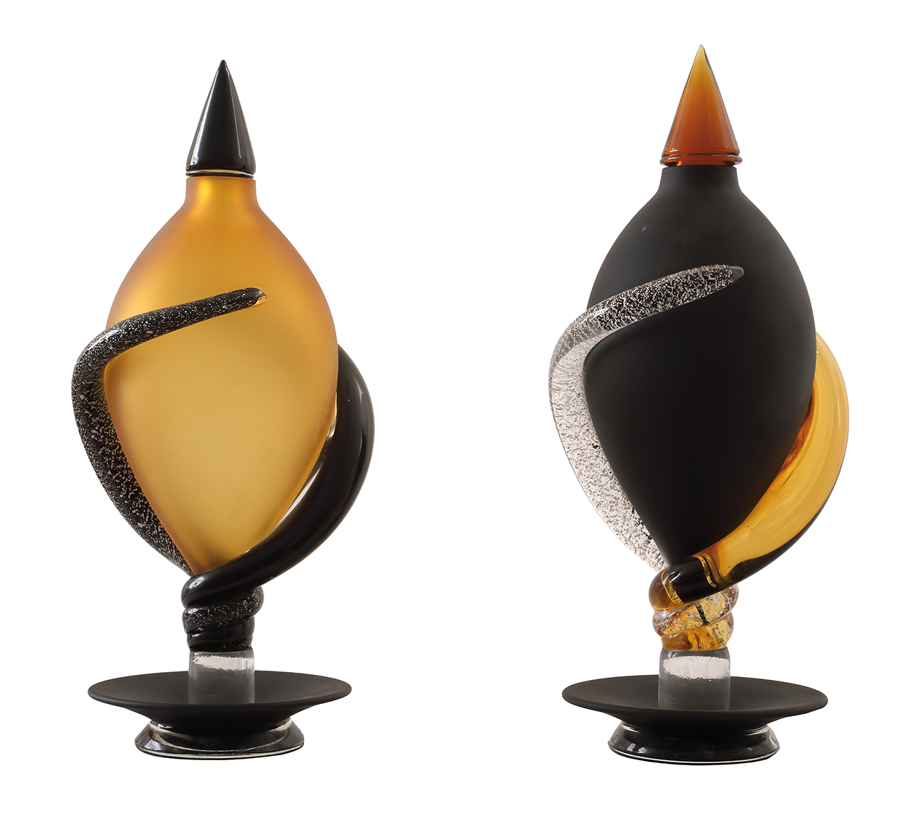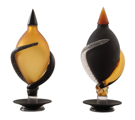 MURANO - ITALIA Coppia di vasi in vetro Murano con coppa satinata arancione e nero e spirali in vetro lucido arancione, nero e screziato Vetro, 33 x 15 cm Firma sotto la base