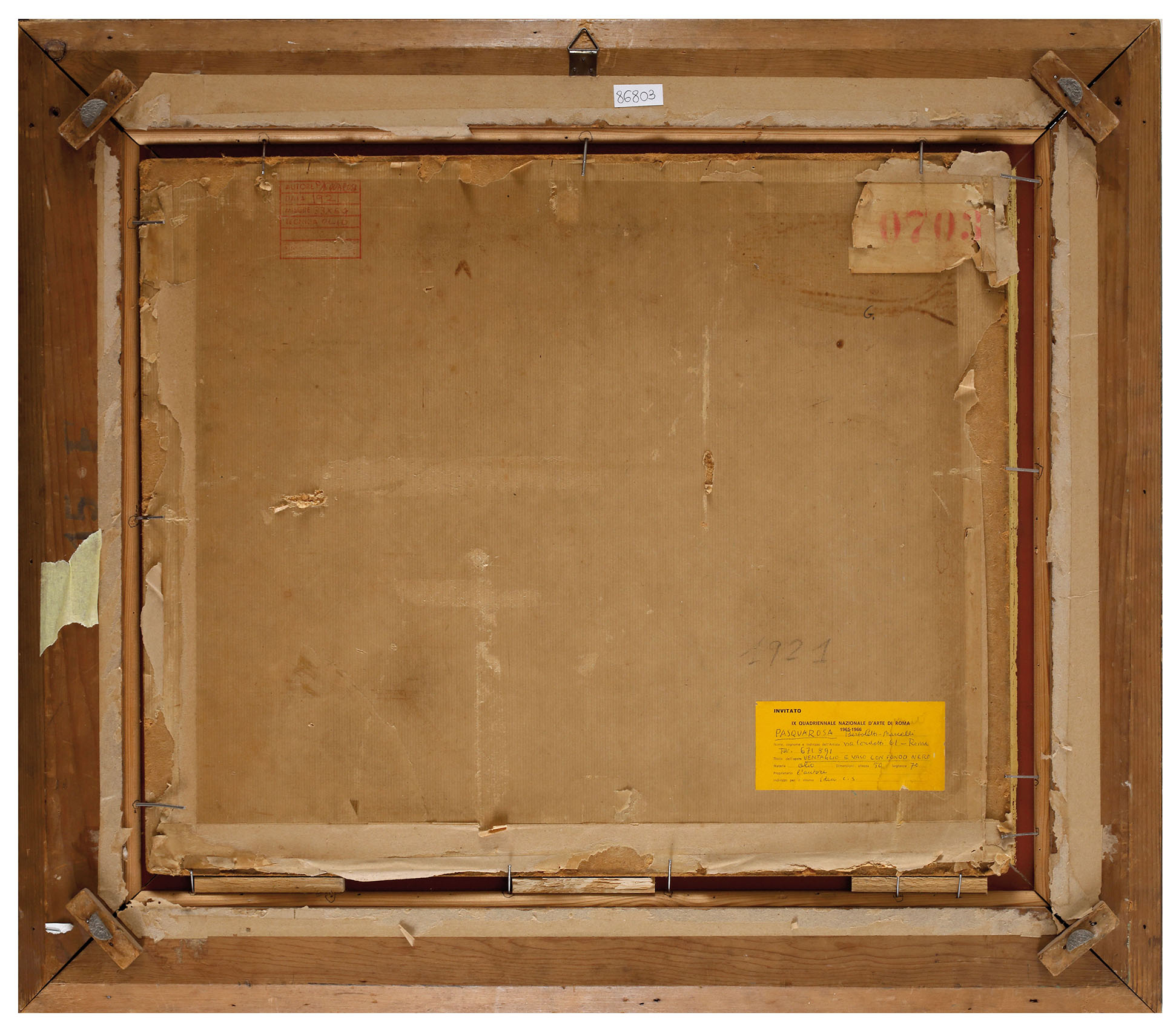 PASQUAROSA MARCELLI BERTOLETTI Ventaglio e vaso con fondo nero, 1921 Olio su masonite, 52,5 x 64,2 cm Firma in basso a destra: Pasquarosa Etichetta al retro della IX Quadriennale Nazionale d’Arte, Palazzo delle Esposizioni, 1965-66, Roma ESPOSIZIONI IX Quadriennale Nazionale d’Arte, Palazzo delle Esposizioni, 1965-66, Roma; Pasquarosa all’Emporio Floreale, 1982 (ripr. b/n in cat.) PUBBLICAZIONI M. P. Maino, C. Virgilio, “Pasquarosa”, Galleria dell’Emporio Floreale, 1982; M. Quesada, “Pasquarosa. Opere dal 1913 al 1962”, Mares Galleria per il Novecento, Edizioni Torchio de’ Ricci, 1995 p. 149, n°6 (l’esemplare del 1953)
