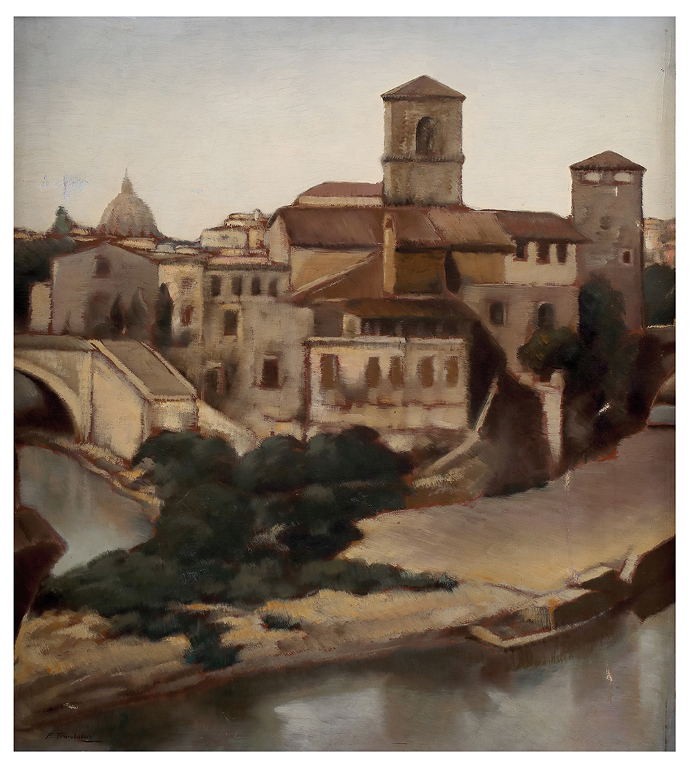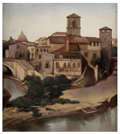FRANCESCO TROMBADORI Isola Tiberina, 1928 Olio su tela, 57 x 50 cm Firma in...
