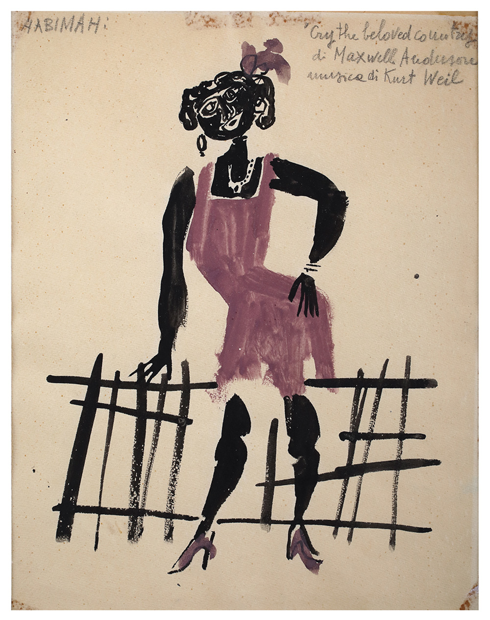 EMANUELE LUZZATI Habimah Tecnica mista su carta marrone, 29,5 x 23 cm circa Titolo in alto a sinistra: Habimah Iscrizione in alto a destra: “City the beloved country” di Maxwell Andersen, musica di Kurt Weill