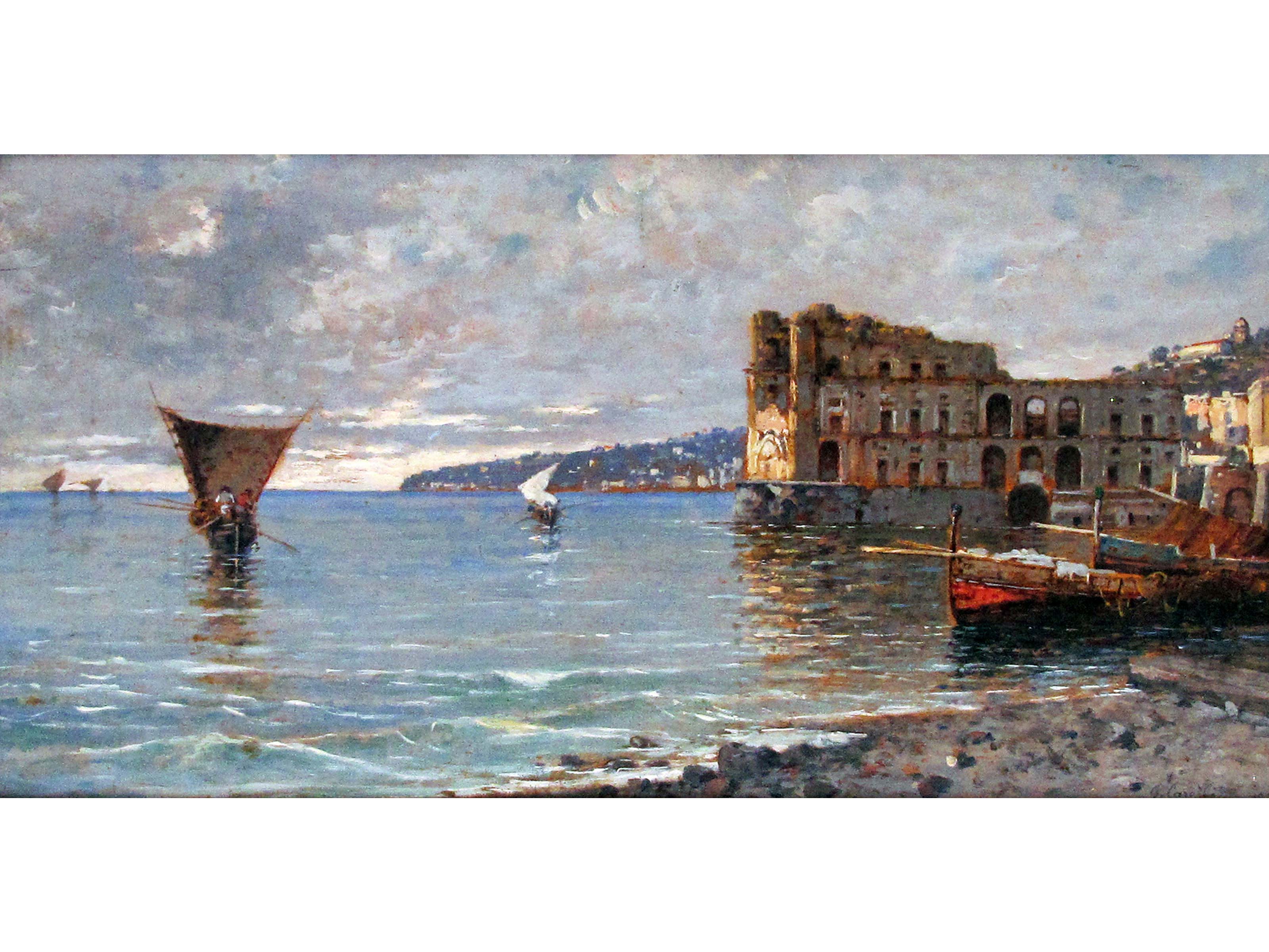 Giuseppe Carelli (Napoli 1858-Portici 1921) Vista di palazzo Donn'Anna Olio su tavola Firmato Misure 41x20 cm