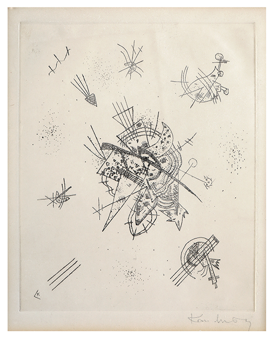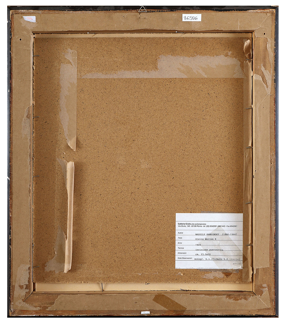 WASSILY KANDINSKY Kleine Welten X, 1922 Incisione puntasecca, 23,5 x 19,5 cm (27,5 x 23 il foglio) Monogramma in basso a sinistra: K Firma in basso a destra: Kandinsky Etichetta e timbro al retro della Galleria Giulia di Roma Certificato di autenticità di Walter Cantatore della Galleria Giulia di Roma, 20 dicembre 2000 PUBBLICAZIONI H.R. Roethel, “Kandinsky Das graphische Werk”, DuMont Schauberg, Colonia, 1970, scheda p. 346, ripr. p. 347 PROVENIENZA Acquisita nel 1980 da Galerie Wolfgang Ketterer München, 20. Jahrhyndert n° 793