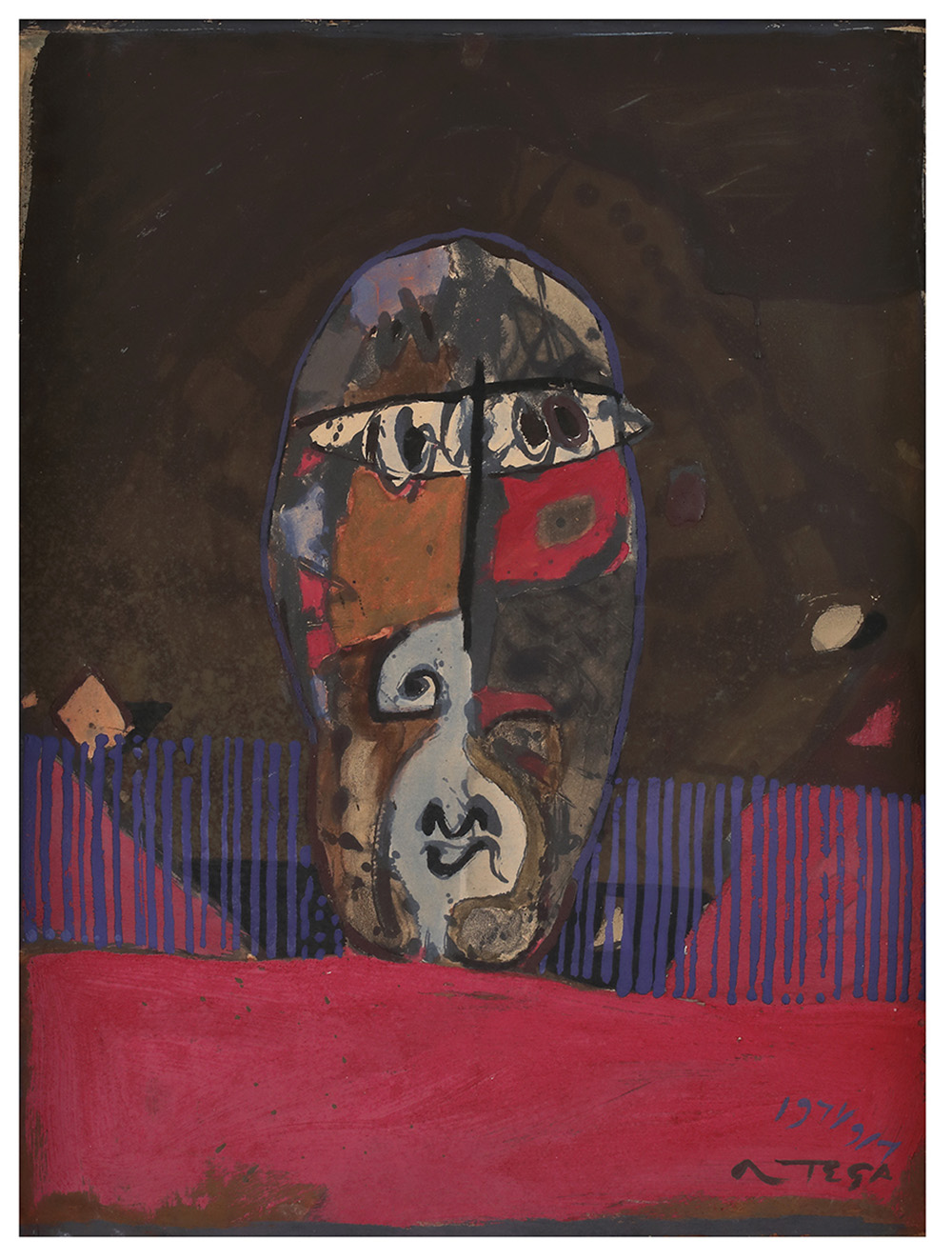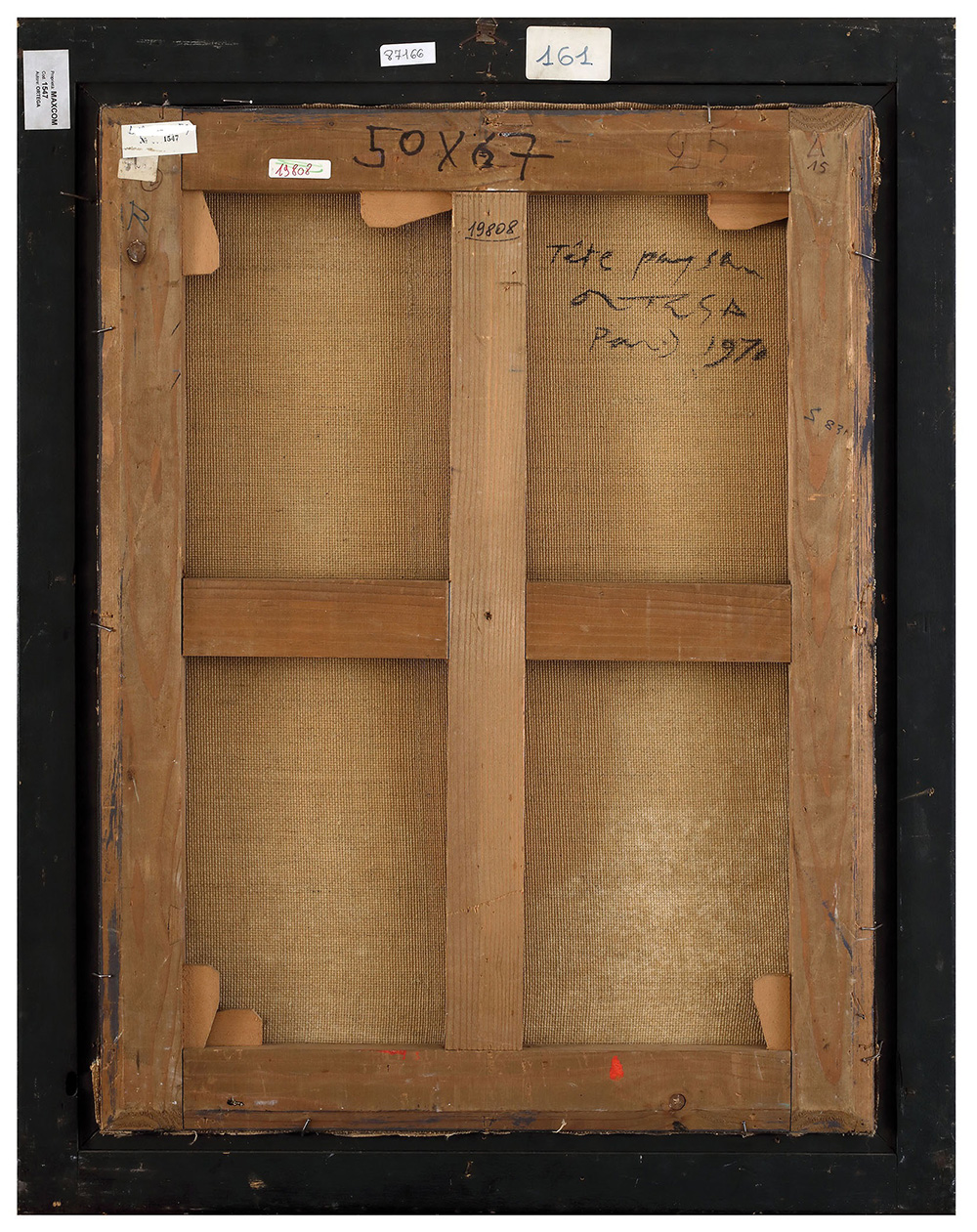 JOSÉ ORTEGA Tête paysan, 1971 Tecnica mista su carta applicata su tela, 67 x 50,5 cm Firma e data in basso a destra: Ortega 1971/9/7 Titolo, firma, luogo e data al retro: Tête paysan, Ortega, Paris, 1970