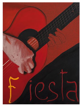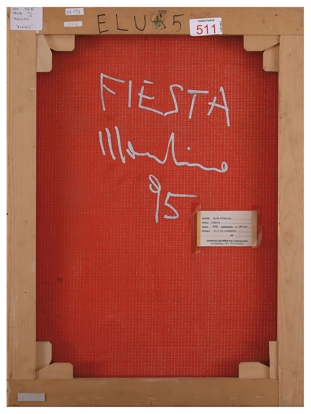ALDO MONDINO Fiesta, 1995 Olio su linoleum, 80 x 60 cm Titolo in basso: Fiesta Titolo, firma e data al retro: Fiesta, Mondino, 95 Etichetta al retro Giampaolo Becherini Arte Contemporanea, Firenze