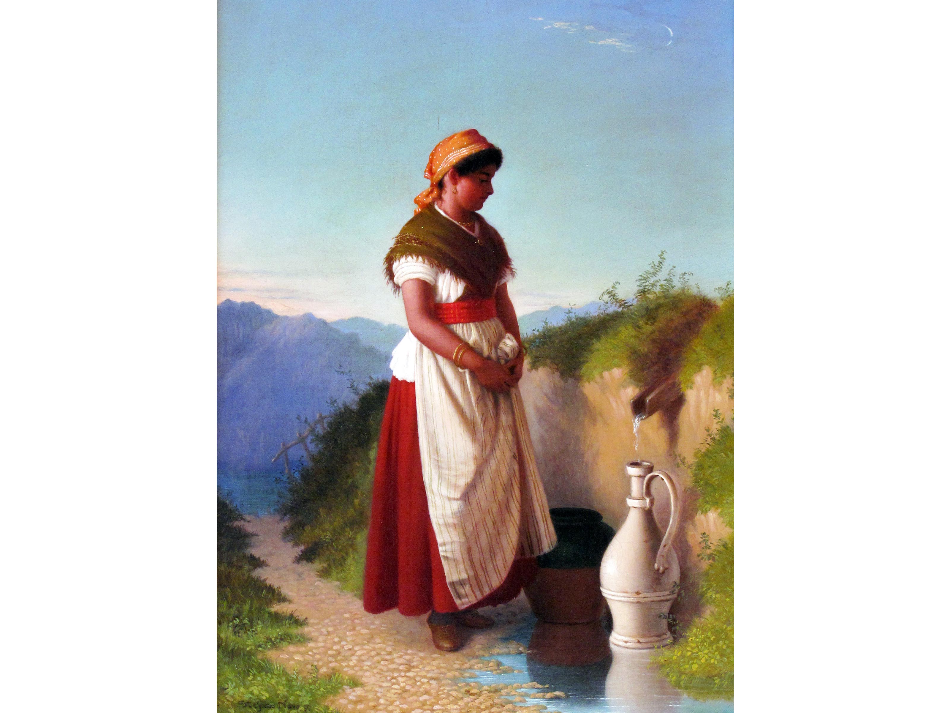 Stefano Novo (Cavarzere, 1862 – 1947) Donna al pozzo Olio su tela Firmato Misure 52.2x37.2 cm