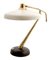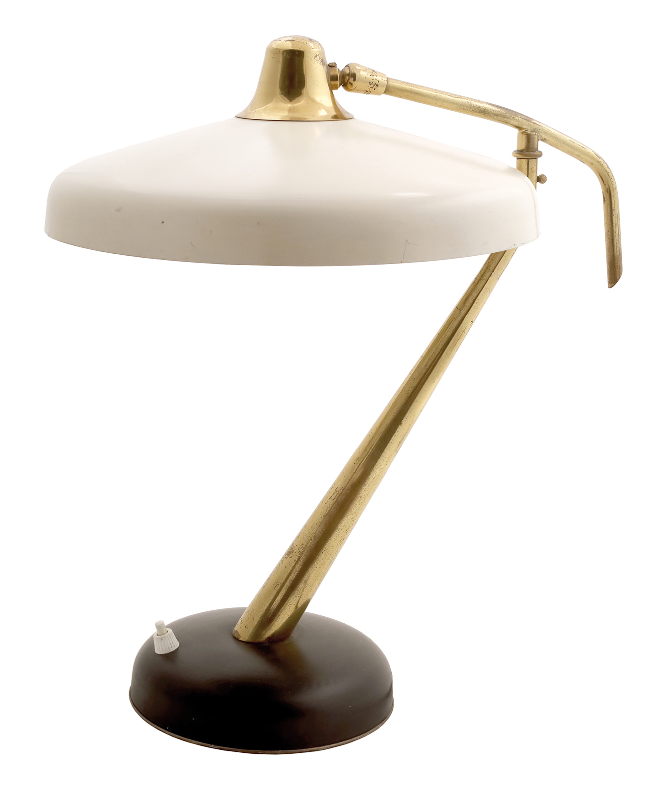 OSCAR TORLASCO Lampada da tavolo con base in ottone nero e paralume in alluminio laccato bianco, 1950 circa Ottone e alluminio, h. 40 cm Produzione Lumi
