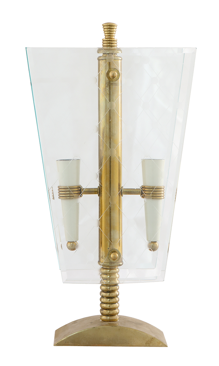 PIETRO CHIESA Lampada da tavolo, fine Anni ‘20 Ottone e vetro, 41 x 21 cm Si tratta di una delle opere di Pietro Chiesa realizzata prima di entrare nella ditta Fontana Arte con Giò Ponti nel 1932