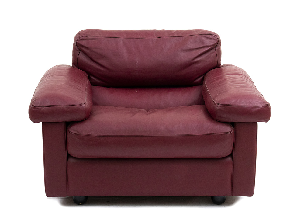 TITO AGNOLI - FRAU Poltrona imbottita di Gino De Dominicis Pelle marrone, 70 x 100 x 86 cm Accompagnata da una dichiarazione su foto di Pio Monti il quale conferma che la poltrona era quella personale dell’Artista ed era collocata nella sua abitazione di via San Pantaleo.
