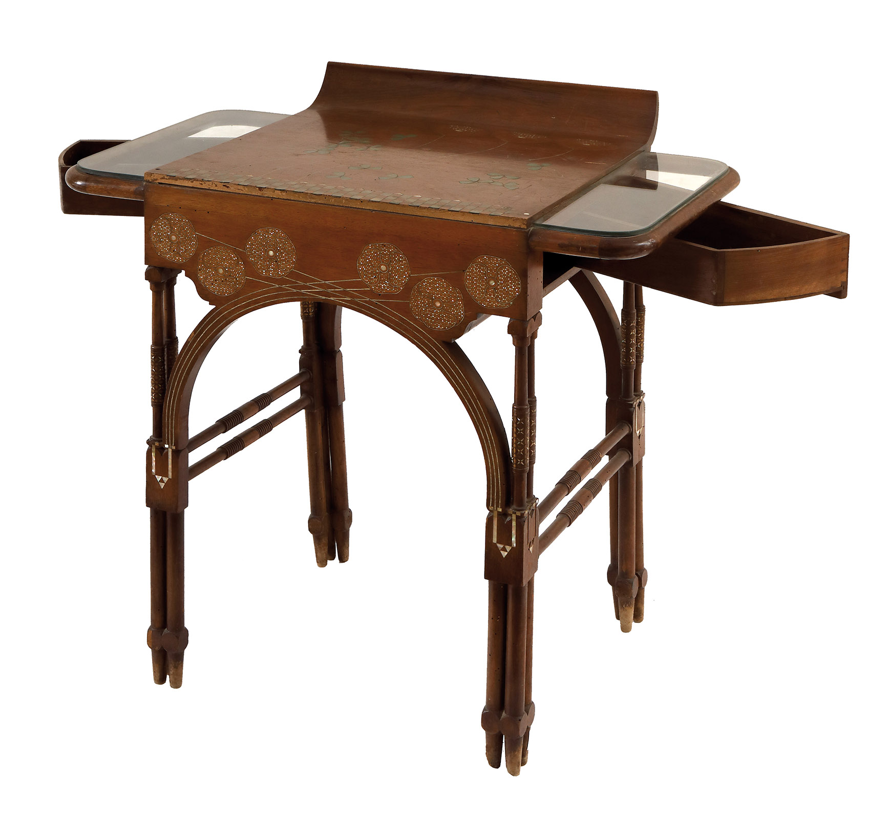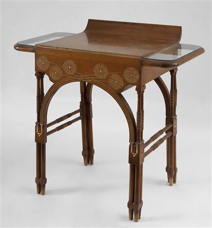 EUGENIO QUARTI Tavolino liberty, Primi del ‘900 Legno palissandro, madreperla, ottone e vetro, 80 x 78 x 47,5 cm Lo stesso modello fu esposto nel 1898 all'Esposizione Internazionale delle Arti Decorative di Torino, poi a Parigi nel 1900 all'Esposizione Universale e infine a Torino all'Esposizione Internazionale del Design del 1902 BIBLIOGRAFIA O. Selvafolta, "Stile Liberty mobili", Larousse, Paris, 1985, pp. 68 e 69; I. de Gutry, M. P. Maino, "Il Mobile Liberty Italiano", Laterza Publishing, Roma, 1994, p. 189; A. Melani, "Arte decorativa italiana e Industriale", Anno XIII, n ° 2, nuova serie, nel febbraio 1904, Milano, 1904; C. Alberici, R. Bossaglia, “Eugenio e Mario Quarti: dall’ebanisteria liberty all’arredamento moderno, Milano, 1980, pp. 7-9; R. Bossaglia, "Bugatti-Quarti", Roma, 1981.