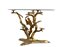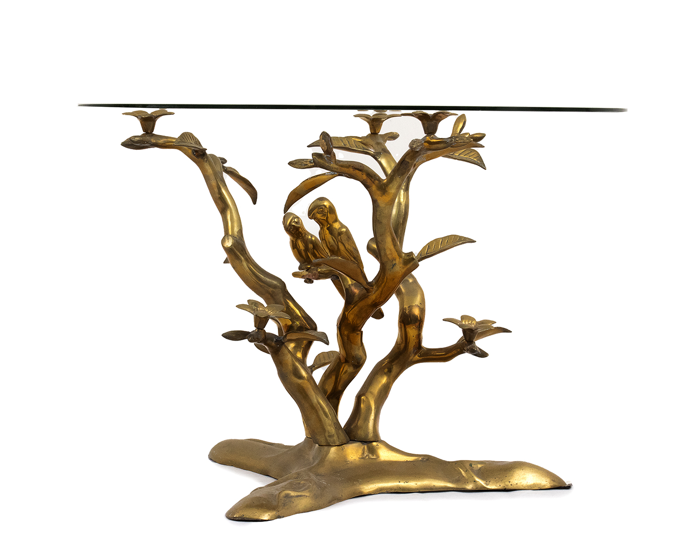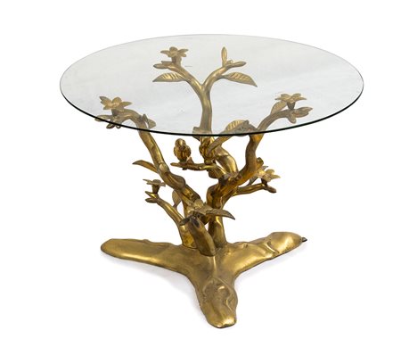 WILLY DARO Tavolinetto con base in bronzo lavorata a rami d’albero e decorata con uccellini e ripiano in cristallo Bronzo dorato e vetro, 47 x 69 cm