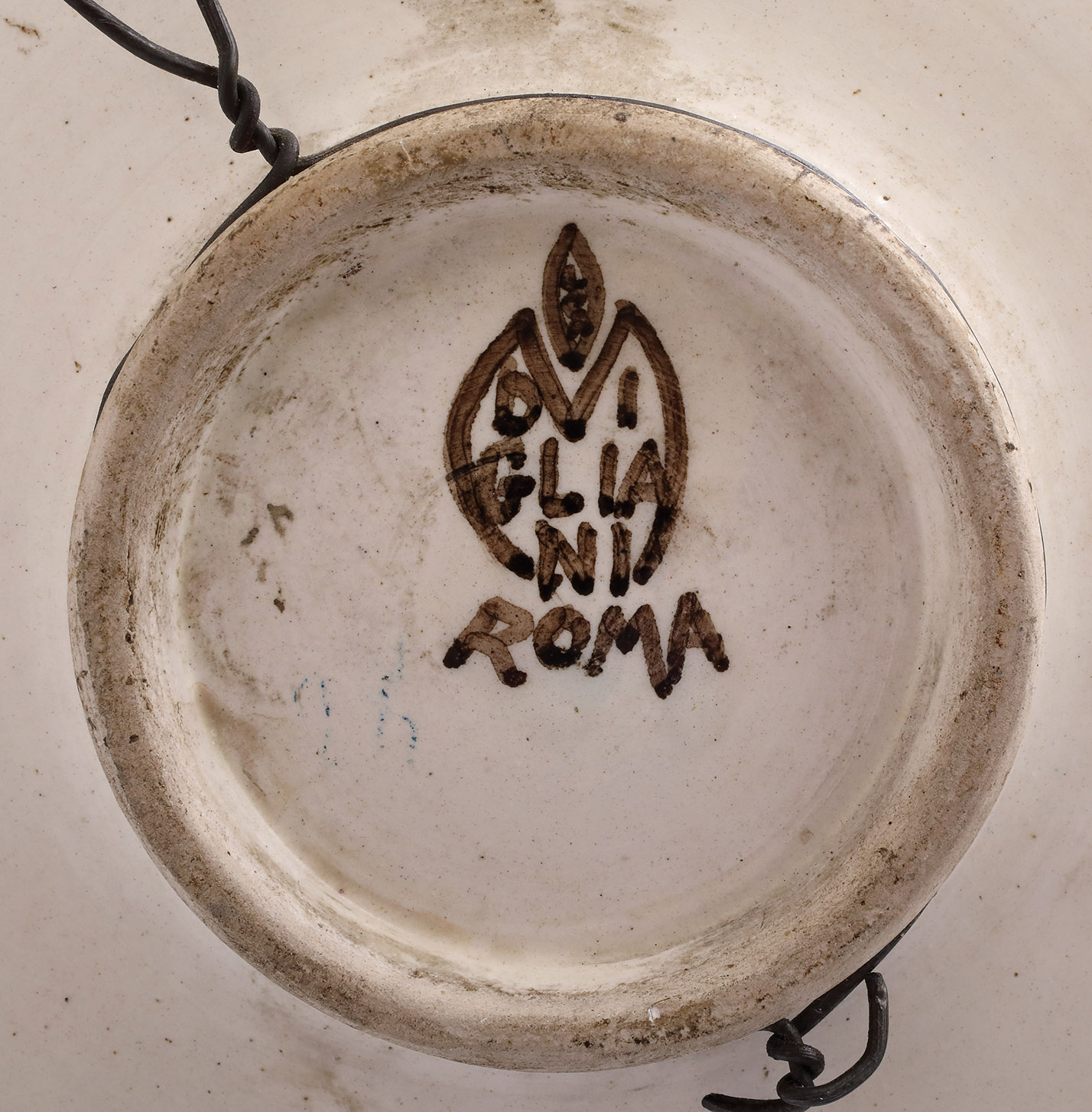 OLGA MODIGLIANI Piatto con pappagallo e uccellino Ceramica policroma, 19,9 x 19,9 x 2,9 cm Firma e luogo sotto la base: Modigliani Roma
