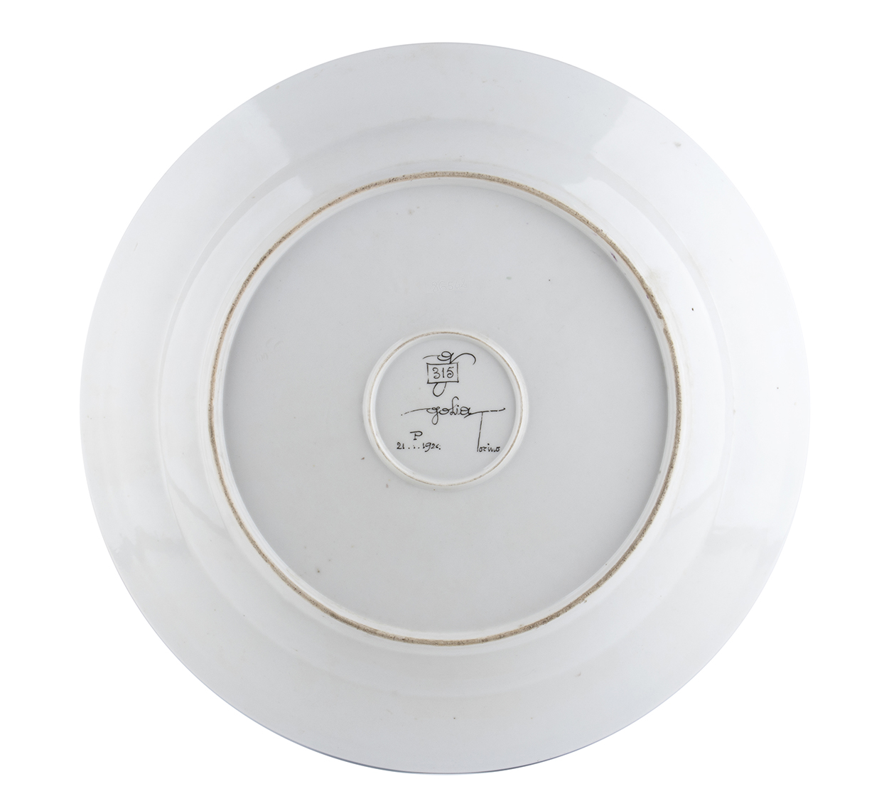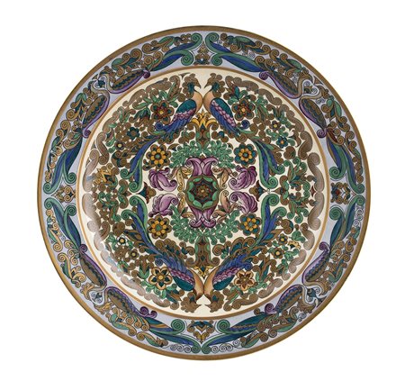 EUGENIO COLMO, detto GOLIA Piatto con pavoni e decorazioni vegetali Ceramica dipinta con smalti e bordo oro, 6,5 x 41,5 cm Iscrizione sotto la base: 315 Golia, 21.1926, Torino