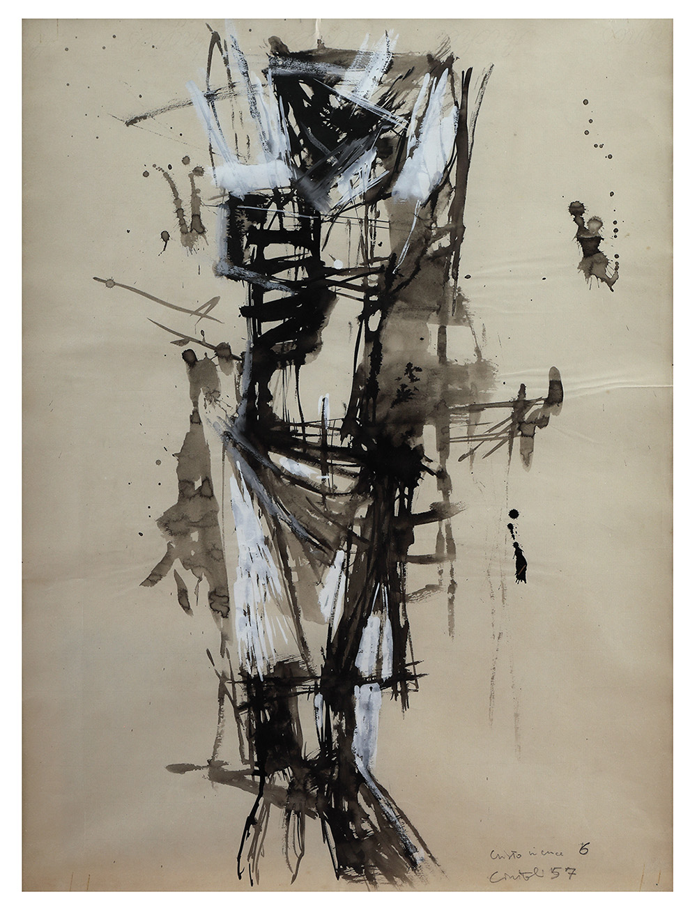 CLAUDIO CINTOLI Cristo in croce, 1957 Tecnica mista su carta, 62 x 47 cm circa Titolo, n° esemplare, firma e data in basso a destra: Cristo in croce, 6, Cintoli 57 Autentica al retro del fratello Vittorio Cintoli