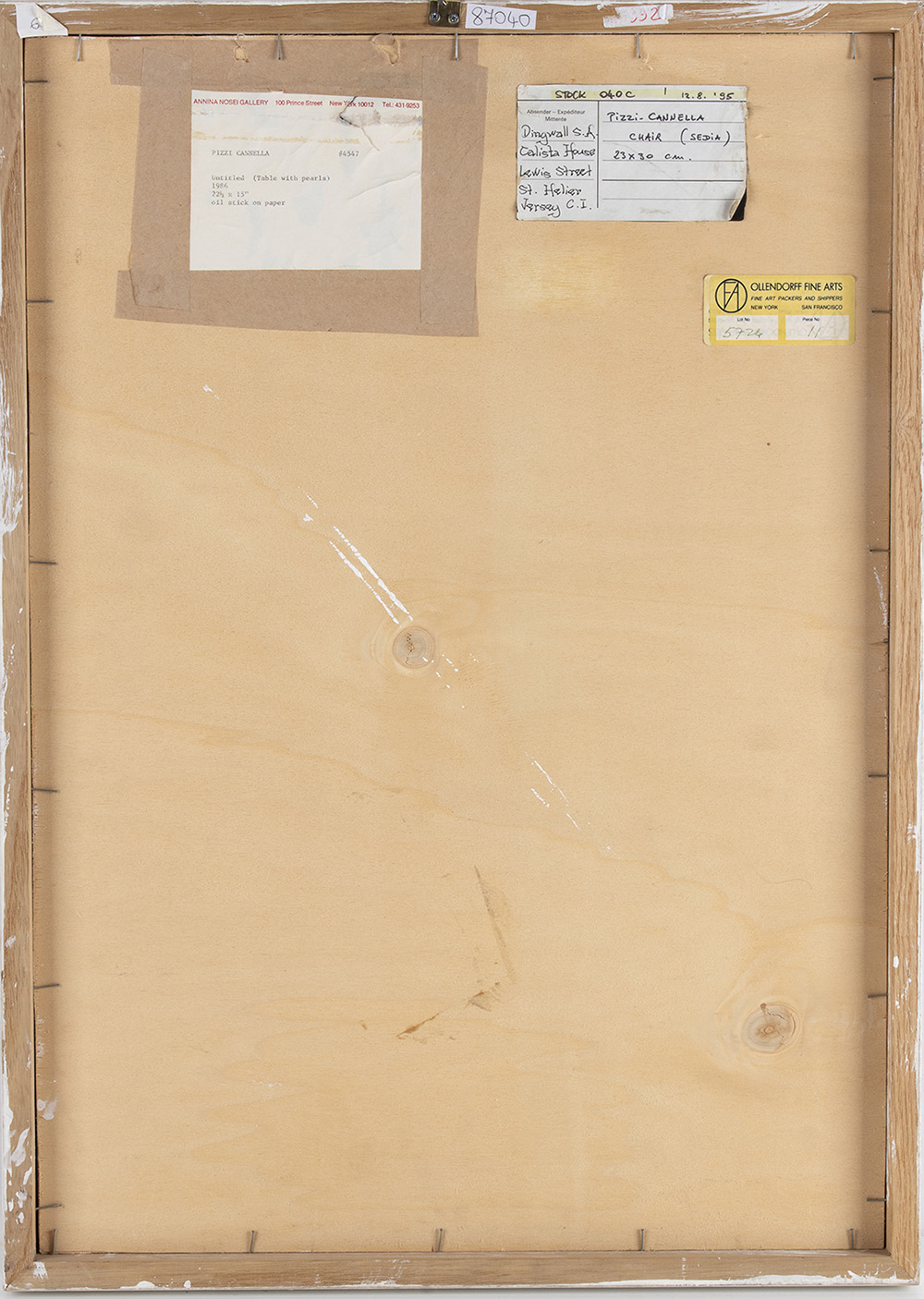 PIERO PIZZI CANNELLA Senza titolo (Table with pearl), 1986 Tecnica mista su carta, 56,5 x 38 cm Firma e data al retro: Pizzi Cannella 1986 Etichetta al retro della Annina Nosei Gallery, New York Autentica su foto dell’Artista PUBBLICAZIONI Catalogo della mostra “Fragili eroi. Storia di una collezione”, Palombi, 2016, p. 90 ESPOSIZIONI “Fragili eroi. Storia di una collezione” a cura di A. Dambruoso, 11 febbraio - 10 aprile 2016, Museo Carlo Bilotti, Roma;