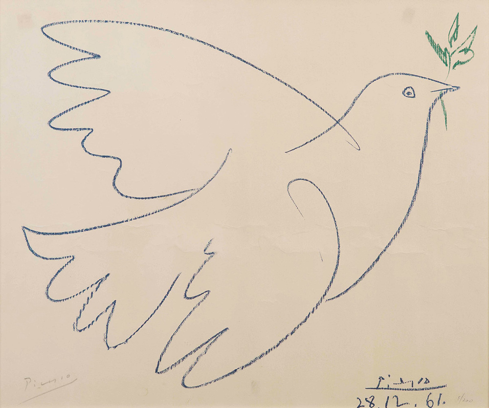 Pablo Picasso (1881-1973), Colomba della pace, 1961 litografia a colori, cm 49x59 firmata e datata in basso a destra, firmata in basso a sinistra es. 5/200 L’opera presenta segni di scotch negli angoli superiori e nella parte centrale sono presenti evidenti pieghe.