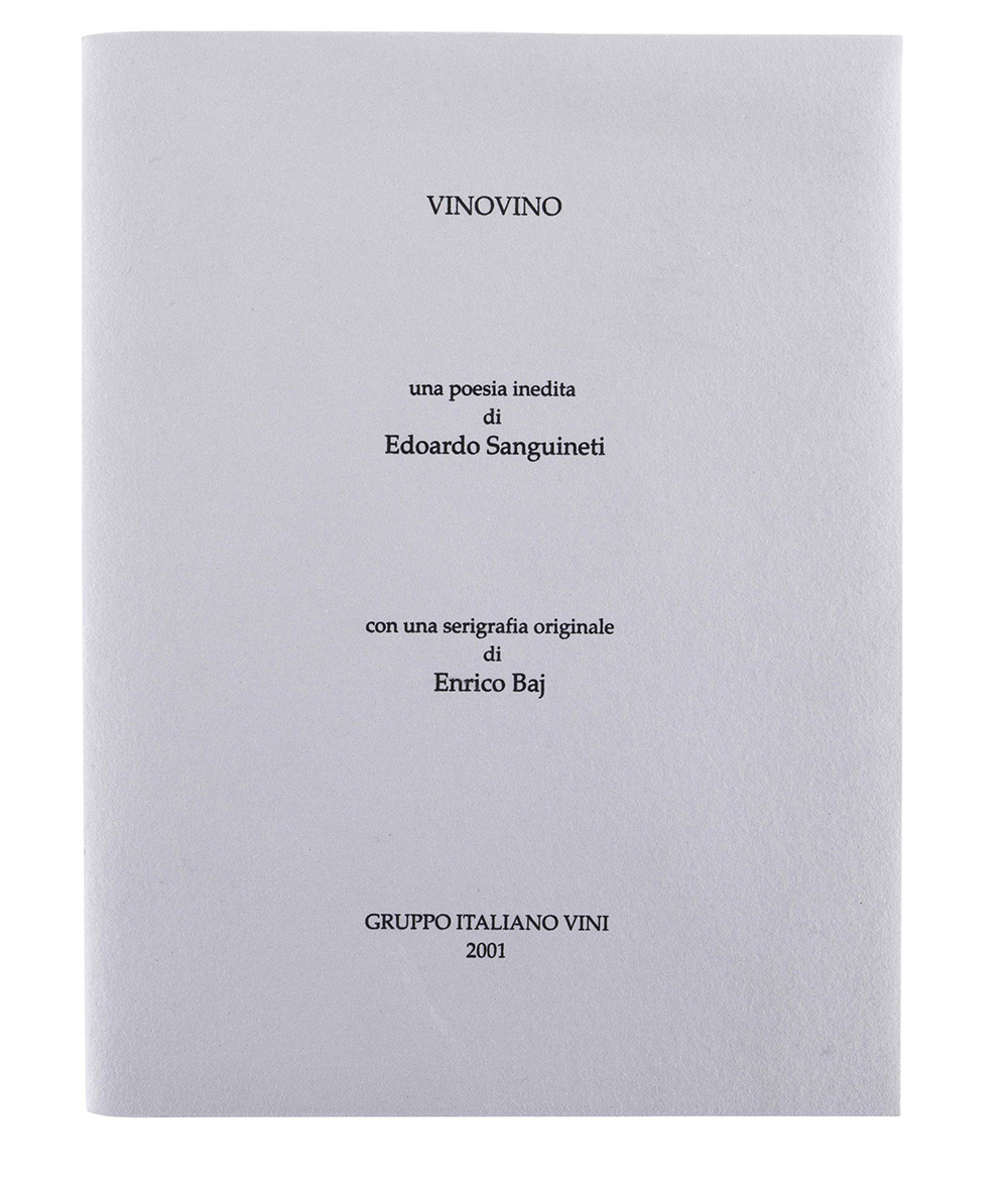 Edoardo Sanguineti – Enrico Baj, “VINOVINO” Cartella in carta Fabriano uso mano con copertina piegata a busta. Una poesia inedita di Sanguineti e una serigrafia originale a colori di Baj numerata e firmata. Tiratura in 180 esemplari Gruppo Italiano Vini, 2001