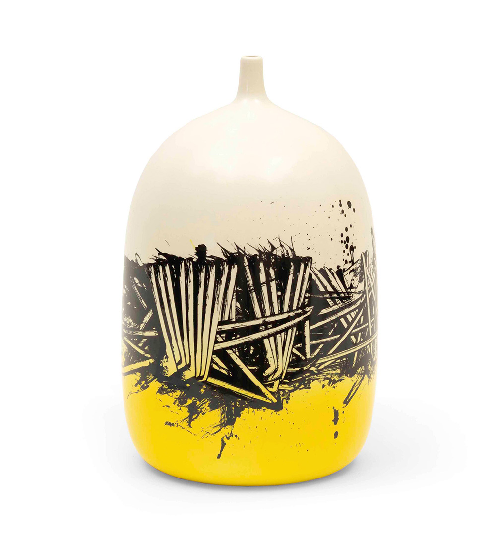 Emilio Scanavino (1922-1986), Vaso, 1980 ceramica multipla policroma a 3° Fuoco, decorazione nera con base gialla, diametro cm 24, altezza cm 40 es. 19/50