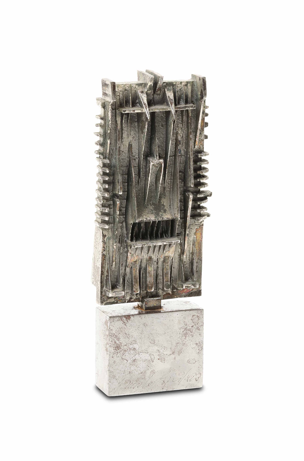 Arnaldo Pomodoro (1926), Piccola scultura, 1977 bronzo argentato, cm 12,5 x 6,5; compresa la base cm 17,5x7x2,5 ca firmato sulla base es. 128/300 Opera registrata presso l’Archivio Arnaldo Pomodoro, Milano, con il n. M/77/7