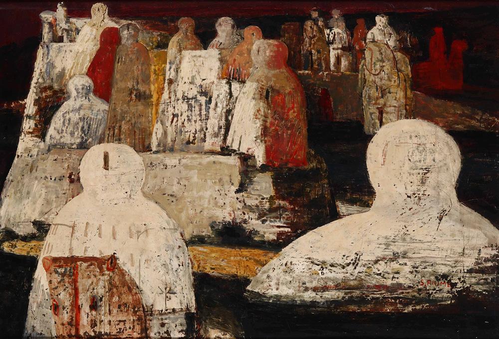 Lotto 126 | Salvatore Fiume (1915-1997), Isola con statue olio su tavola, cm 36x55...