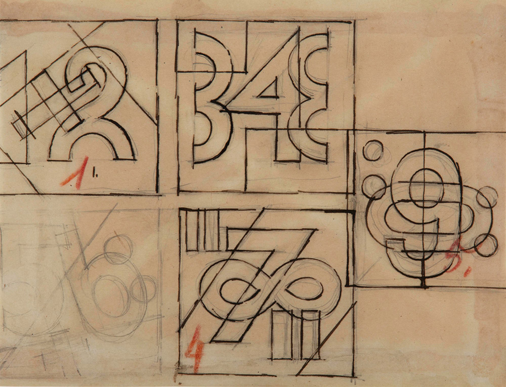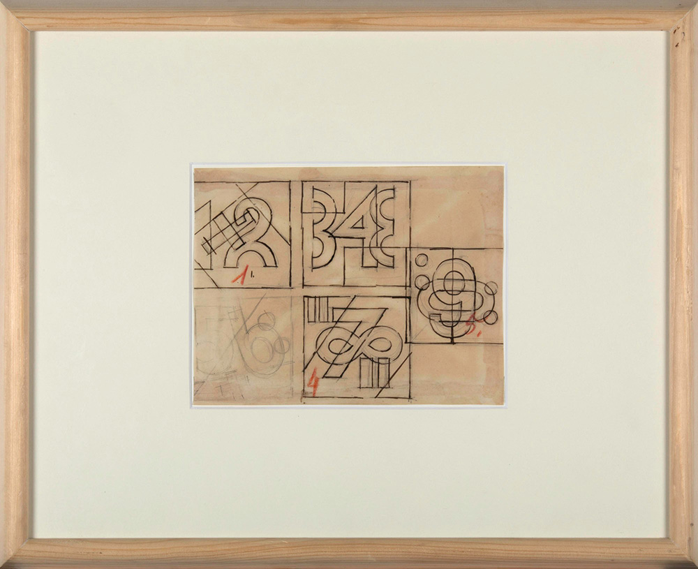 Fortunato Depero (1892-1960), Composizioni numeriche (studi per cuscini), 1927 matita e china su carta, cm 18x23,5 Bibliografia: Studio 53 Arte. Depero 50 Campari, a cura di Maurizio Scudiero. 30 gennaio - 31 marzo 2009. La grafica srl, Trento, p. 39 L’opera presenta visibile segno della colla al retro