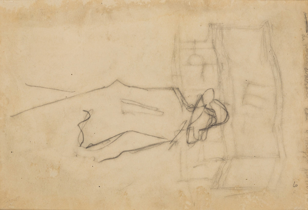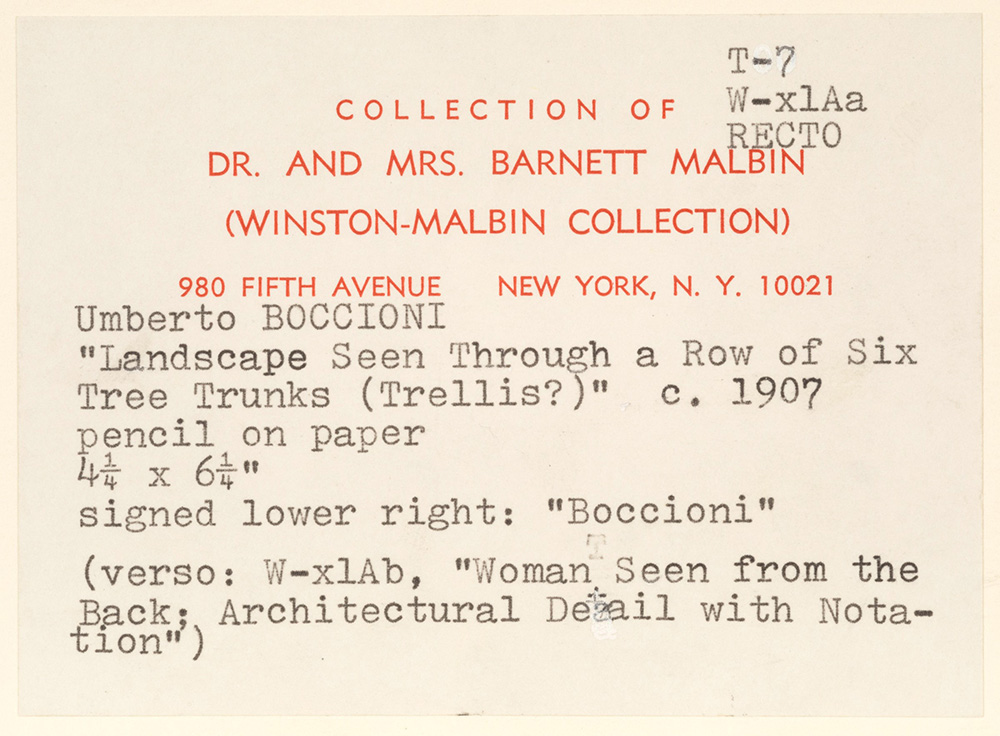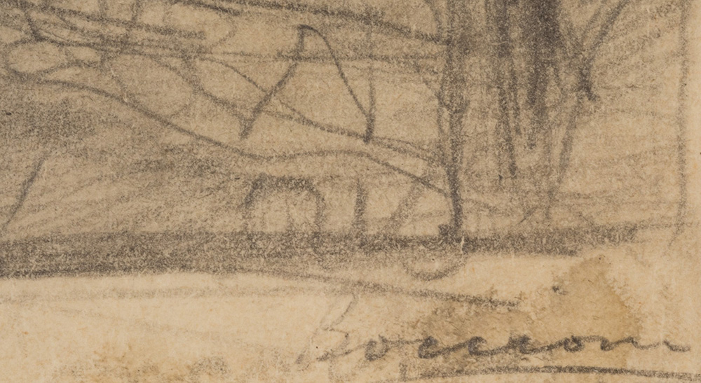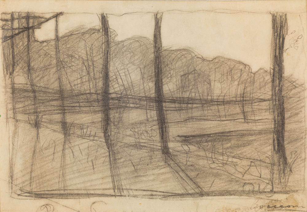 Umberto Boccioni (1882-1916), Studio per Campagna Lombarda, 1908 matita su carta, cm 10,8x15,9 firmato in basso a destra Provenienza: Museum of Modern Art, New York Collezione Winston Malbin Collezione privata, Milano Bibliografia: Taylor, The Grafic Works of Umberto Boccioni, 1961, n. 7 (1907 circa) Archivi del Futurismo, 1962, n. 177 G. Ballo, Boccioni, 1964, n. 132 Calvesi-Coen, Boccioni l’opera completa, Ed. Electa, 1983, n. 325