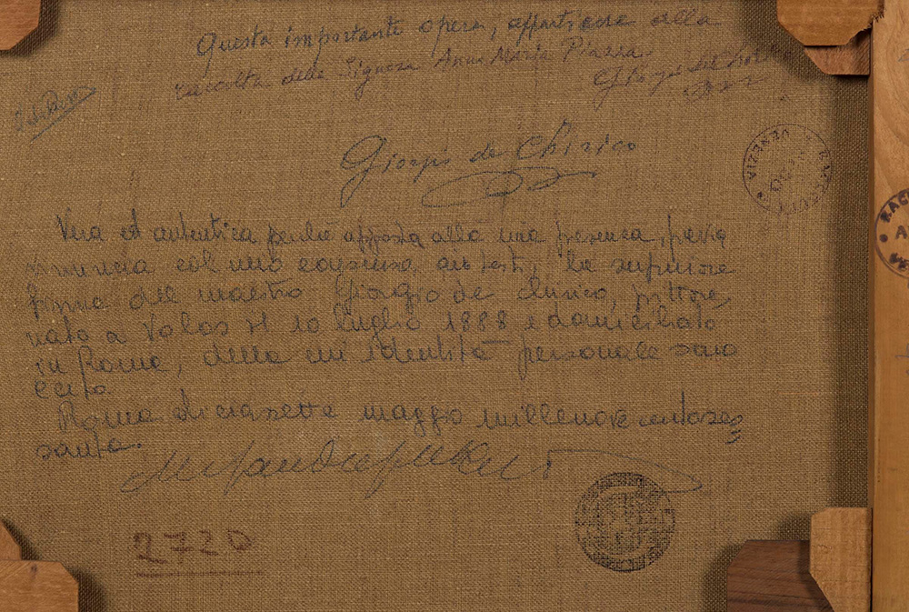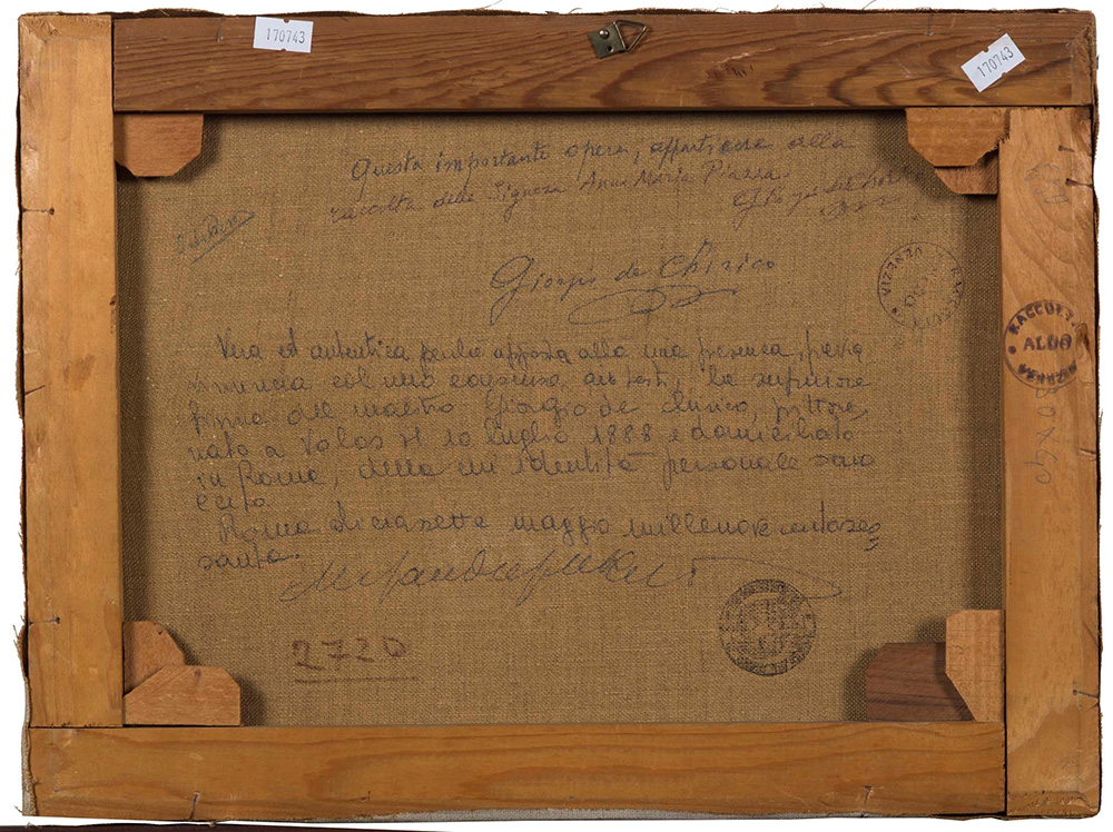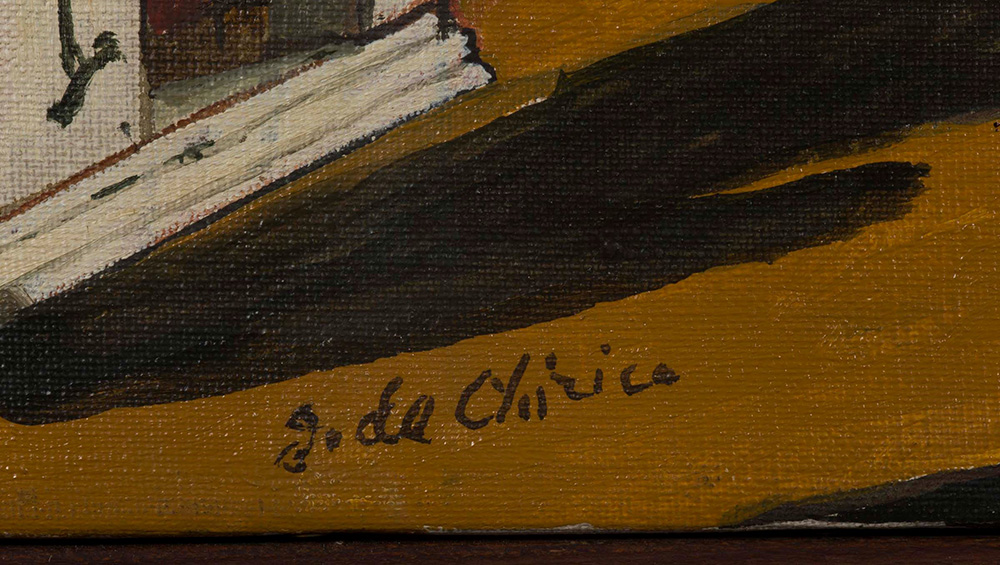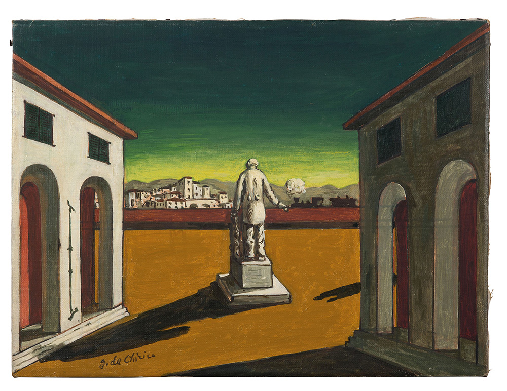 Giorgio De Chirico (1888-1978), Piazza d'Italia, fine anni ‘50 olio su tela, cm 30x40 firmato in basso a destra firmato al retro Timbro al retro della Collezione Aldo Seno, Venezia Opera registrata presso la Fondazione Giorgio e Isa de Chirico, Roma, con il n. 007/06/18 OT Provenienza: Anna Maria Piazza, donato da De Chirico Collezione Aldo Seno, Venezia Ceduta dal nipote Paolo Seno all’attuale proprietario tra il 1965/67 ca, ivi rimasta fino ad ora, Collezione privata, Milano