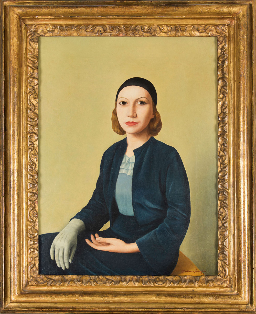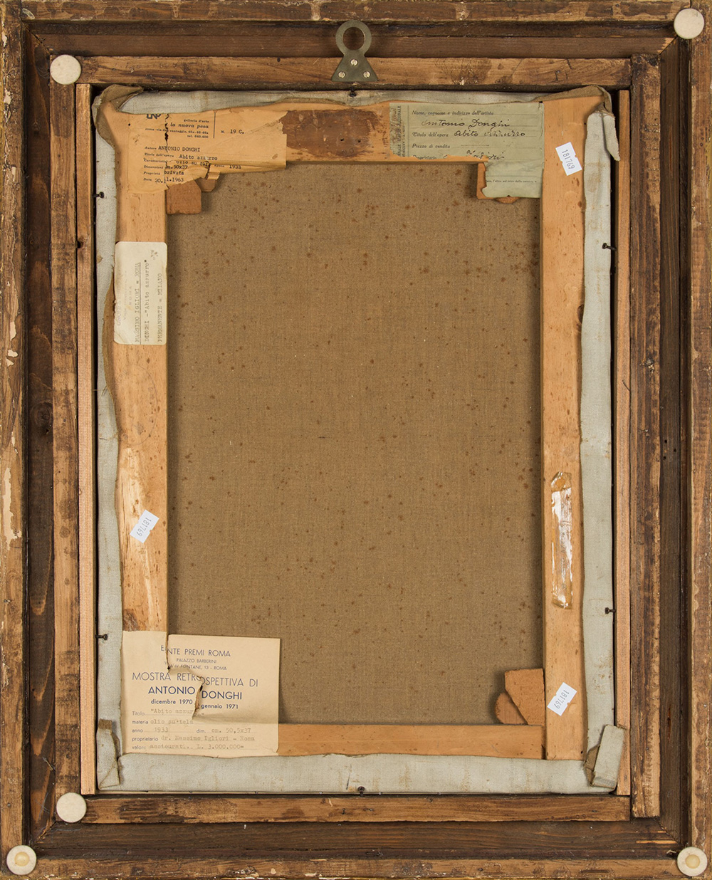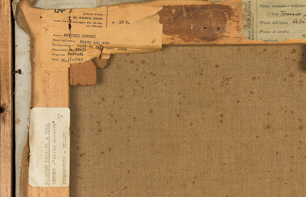 Antonio Donghi (1897-1963), Abito azzurro, 1933 olio su tela, cm 50x37,5 firmato e datato in basso a destra Timbro al retro della Galleria Philippe Daverio Etichetta al retro della II Quadriennale d’Arte Nazionale, Roma, 1935 Etichetta al retro dell’Ente Premi Roma Etichetta al retro della Galleria d’Arte La Nuova Pesa, Roma Provenienza: Galleria Baldacci e Porro, Milano Collezione privata, Milano Esposizioni: II Quadriennale d’Arte Nazionale, Roma, 1935; Galleria La Nuova Pesa, Roma, 1963, n. 19; Mostra retrospettiva di Antonio Donghi, Palazzo Barberini, Roma dicembre 1970 - gennaio 1971; Ente Premi Roma, n. 39, 1971; Programma, Torino, 1986 Bibliografia: Seconda Quadriennale d’arte nazionale. Catalogo generale, Tumminelli & C., Roma-Milano, 1935, pp. 73-74; Antonio Donghi Sessanta dipinti dal 1922 al 1961, Palazzo Braschi, Roma, De Luca Editore, 1985, p. 132, tav. b; Antonio Donghi. Vita e opere, Maurizio Fagiolo dell’Arco e Valerio Rivosecchi, Umberto Allemandi & C., Torino, 1990, p. 201, tav. 89 L’opera presenta in corrispondenza del telaio superiore crquelure, la tela presenta foxing sul retro