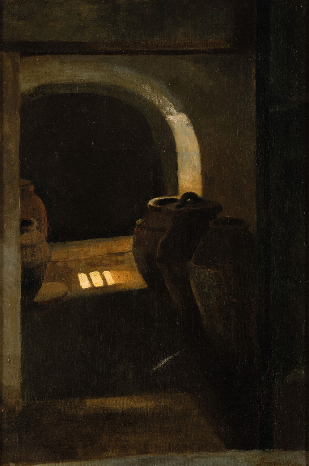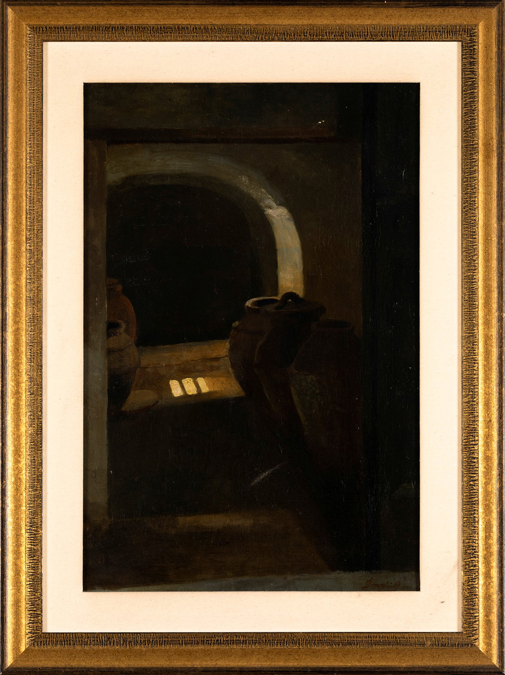 Antonio Donghi (1897-1963), Interno, 1922 ca olio su tela, cm 60x40 firmato e datato in basso a destra Opera registrata presso l’Archivio della Scuola Romana, Roma, con il n. 345/03, in data 15 luglio 2003 L’opera presenta nell’angolo di sinistra un intervento di restauro, visibile con la lampada di Wood