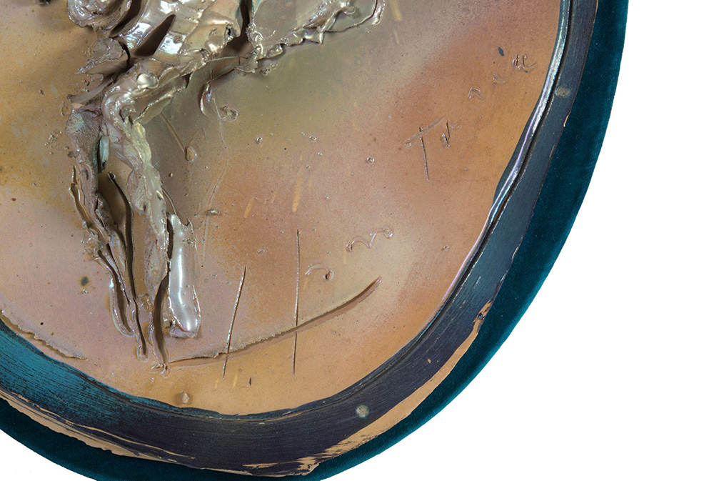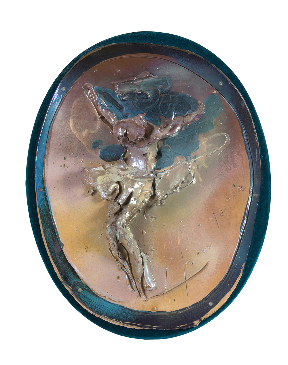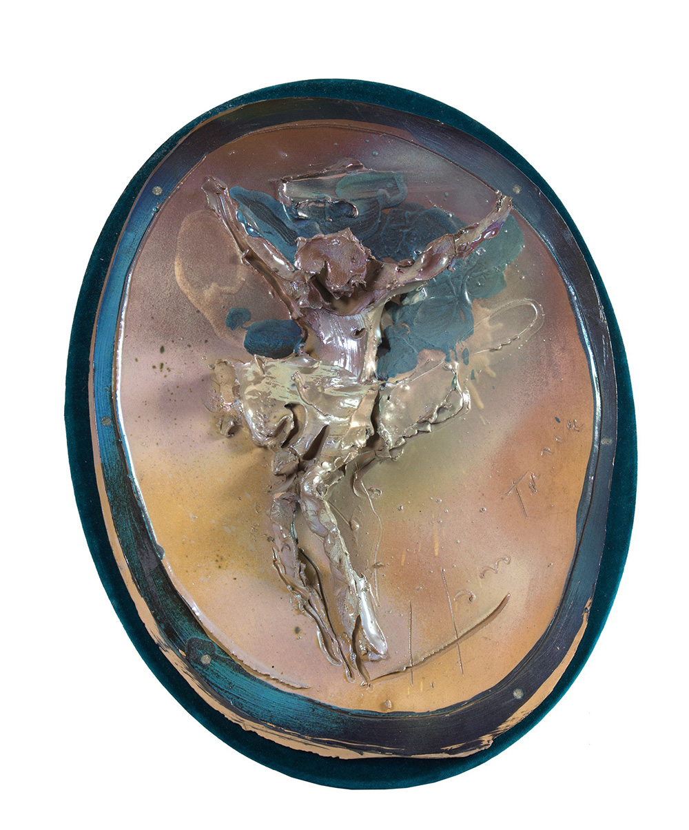 Lucio Fontana (1899-1968), Crocifissione, 1950-1955 ceramica colorata, cm 37,5x29,5x9 firmata Opera registrata presso l'Archivio Lucio Fontana, Milano, con il n. 3016/1 L’opera riporta una sbeccatura sul braccio di destra, nel ginocchio di sinistra e piccola sbeccatura sulla spalla di destra