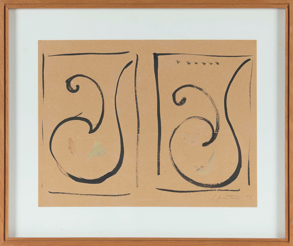 Lucio Fontana (1899-1968), Due studi per Manifesto IX Triennale di Milano, 1951 china e acquerello su carta, cm 22x28,5 firmato e datato in basso a destra Opera registrata presso l’Archivio Lucio Fontana, Milano, con il n. 2946/1 Provenienza: Collezione Architetto Luciano Baldessari, donato all’attuale proprietario l'opera presenta una piega lungo tutta la superficie