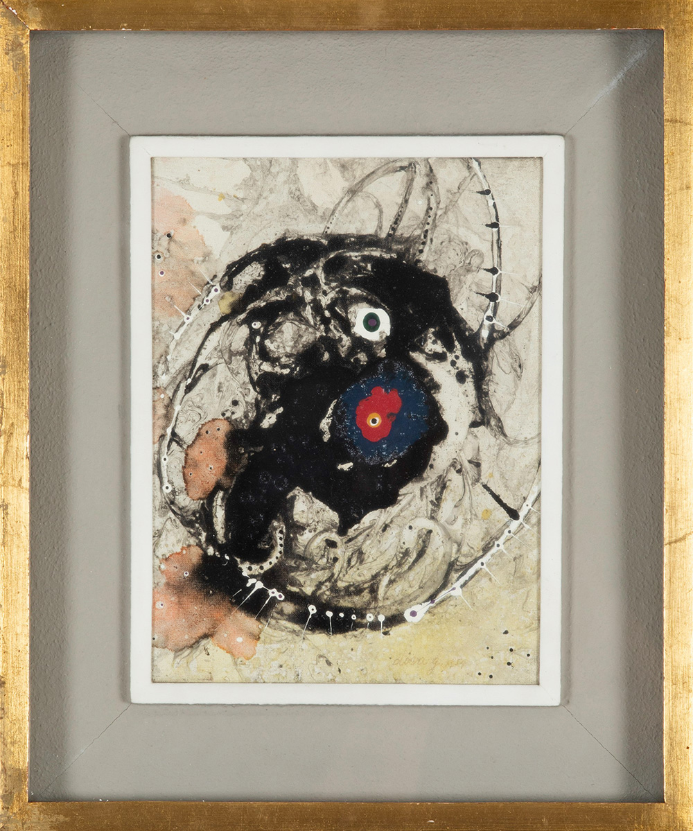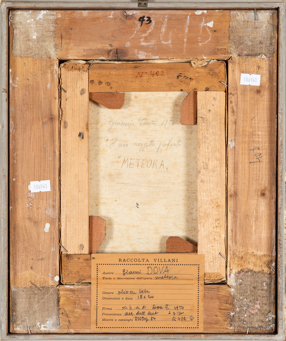 Gianni Dova (1925-1991), Nebuloso (Meteora), 1954 olio su tela, cm 24x18 firmato e datato in basso a destra firmato, intitolato e datato al retro L’opera verrà inserita nel prossimo catalogo dell’autore Provenienza: Collezione Dino Villani Galleria Montrasio Arte, Monza Collezione Volker Feierabend, Milano Bibliografia: D. Villani, Il Romanzo di una raccolta Editrice d'Arte Cavour. 800 Pittori allo Specchio. Ubezzi & Dones,Milano, 1971, p. 84 buono stato