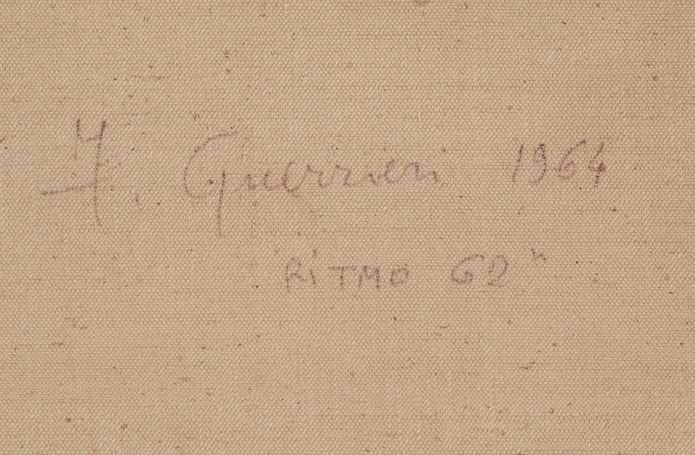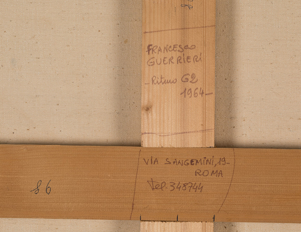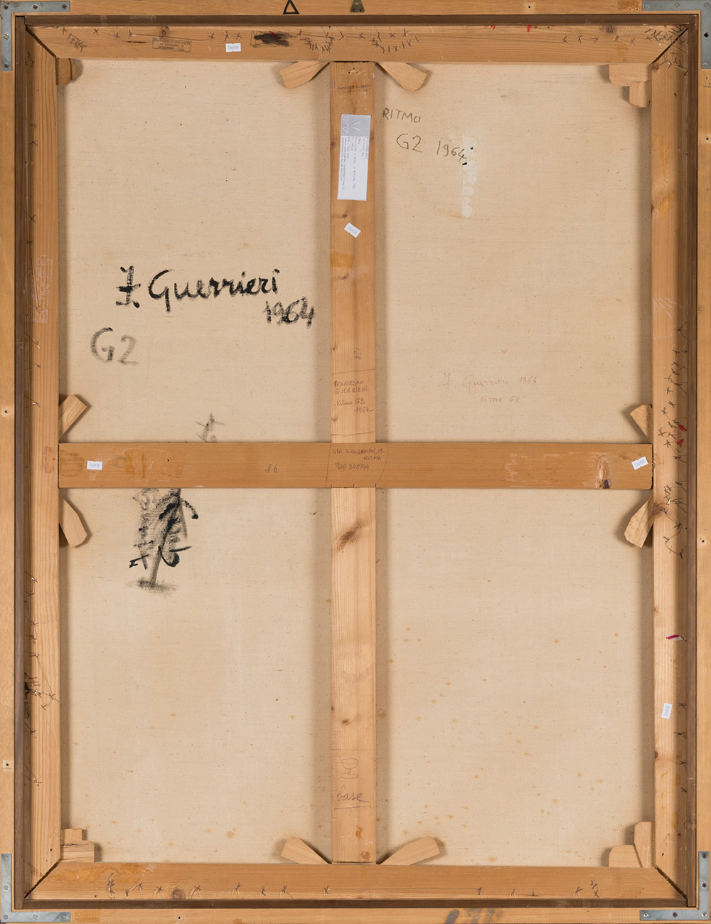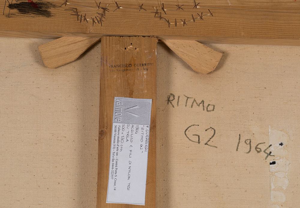 Francesco Guerrieri (1931-2015), Ritmo G2, 1964 acrilico e fili di nylon tesi su tela, cm 130x100 firmato, intitolato e datato al retro; Etichetta al retro dello Valmore Studio d’arte, Vicenza; Timbro al retro dello Studio dell’artista Provenienza:; Studio d'Arte Valmore, Vicenza; MART, Museo d'arte Moderna e Contemporanea di Trento e Rovereto; Collezione VAF Stiftung, Francoforte sul Meno; Collezione Volker Feierabend, Milano Esposizioni: Sperimentale p., Lia Drei e Francesco Guerrieri. Manifesto, catalogo della mostra (Firenze, Galleria Aquilone, 1964), Galleria Aquilone, Firenze 1964; XV premio Avezzano. "Strutture di visione", a cura di G. Tempesti, I. Tomassoni, catalogo della mostra (Avezzano, Palazzo Torlonia, agosto 1964), Edizioni dell'Ateneo, Avezzano 1964, p. 151; Sperimentale p., Lia Drei e Francesco Guerrieri, catalogo della mostra (Torino, Studio di Informazione Estetica, 1966) 1966; Francesco Guerrieri, a cura di U. Apollonio, catalogo della mostra (Venezia, Galleria Il Canale, 1968), Venezia 1968; Francesco Guerrieri, catalogo della mostra (Bergamo, Galleria Studio 2B, 1968) 1968; Francesco Guerrieri, catalogo della mostra (Napoli, Galleria Il Diagramma 32, 1975) 1975; Francesco Guerrieri, opere 1962-1974, testo di F. Menna, catalogo della mostra (Bergamo, Galleria Fumagalli, 1975), Galleria Fumagalli, Bergamo 1975, p. 13; Lo "Sperimentale p.". Lia Drei e Francesco Guerrieri, testo di E. Maurizi, catalogo della mostra (Macerata, Pinacoteca e Musei Comunali, Chiesa Monumentale di San Paolo, ottobre 1981), Coopedit Macerata, Macerata 1981, n. 22, p. 26 (ripr.); Francesco Guerrieri, Il quadro pensiero, opere 1962-1968, a cura di M. Riposati, M. Iannelli, catalogo della mostra (Roma, Galleria Monogramma Arte contemporanea, 25 febbraio - 22 marzo 2000), Monogramma arte contemporanea, Roma 2000; Francesco Guerrieri, catalogo della mostra (Taverna, Museo Civico di Taverna, 2002) 2002; Sperimentale p., Lia Drei e Francesco Guerrieri, 1963-1968, testo di L. Marziano, C. Folcarelli, catalogo della mostra (Roma, Galleria Monogramma, 2007; Viterbo, Galleria Miralli, Palazzo Chigi, 14 ottobre - 10 novembre 2007), Monogramma Arte Contemporanea, Roma 2007, pp. 14-15 (ripr.); Art Verona 09, Valmore studio d'arte (Verona, 2009) 2009; La magnifica ossessione, a cura di N. Boschiero, V. Caciollli, D. Dogheria, D.Ferrari, M. Mariech, P. Pettenella, A. Tiddia, D. Viva, Rovereto, MART, Museo di Arte Moderna e Contemporanea di Trento e Rovereto, Rovereto, 26 ottobre 2012-16 febbraio 2014 Bibliografia: F. Guerrieri, R. Assunto, Ricerche strutturali, Silva, Genova - Roma, 1969, p. 29; F. Guerrieri, Carta di identità di Francesco Guerrieri, Roma, 1973, p. 30; A. Calabrese, Francesco Guerrieri, dalla ragione alla poesia, in "Documenti oggi", II, n.1, Napoli 1976, p. 26; G.C. Argan, M. Grande, F. Menna, A. Spatola, M. Torrente, Francesco Guerrieri, Volume primo, 1960-1980, Le Vigne Nuove, Roma, 1994, p. 62; E. Zucchini, Sperimentale p., Lia Drei e Francesco Guerrieri, 1963-68, in ""Arte Contemporanea", II, n. 9, novembre-dicembre", Grottaferrata (Roma) 2007, p. 62; L. Marziano, Sperimentale p., Lia Drei e Francesco Guerrieri 1963-1968, in "Archivio delle Arti, XIX, n. 3, marzo", Mantova 2007, p. 4; C. Folcarelli, Storia dello Sperimentale p., Lia Drei e Francesco Guerrieri, in "Art&tra", aprile-maggio, Roma 2007, p. 115;