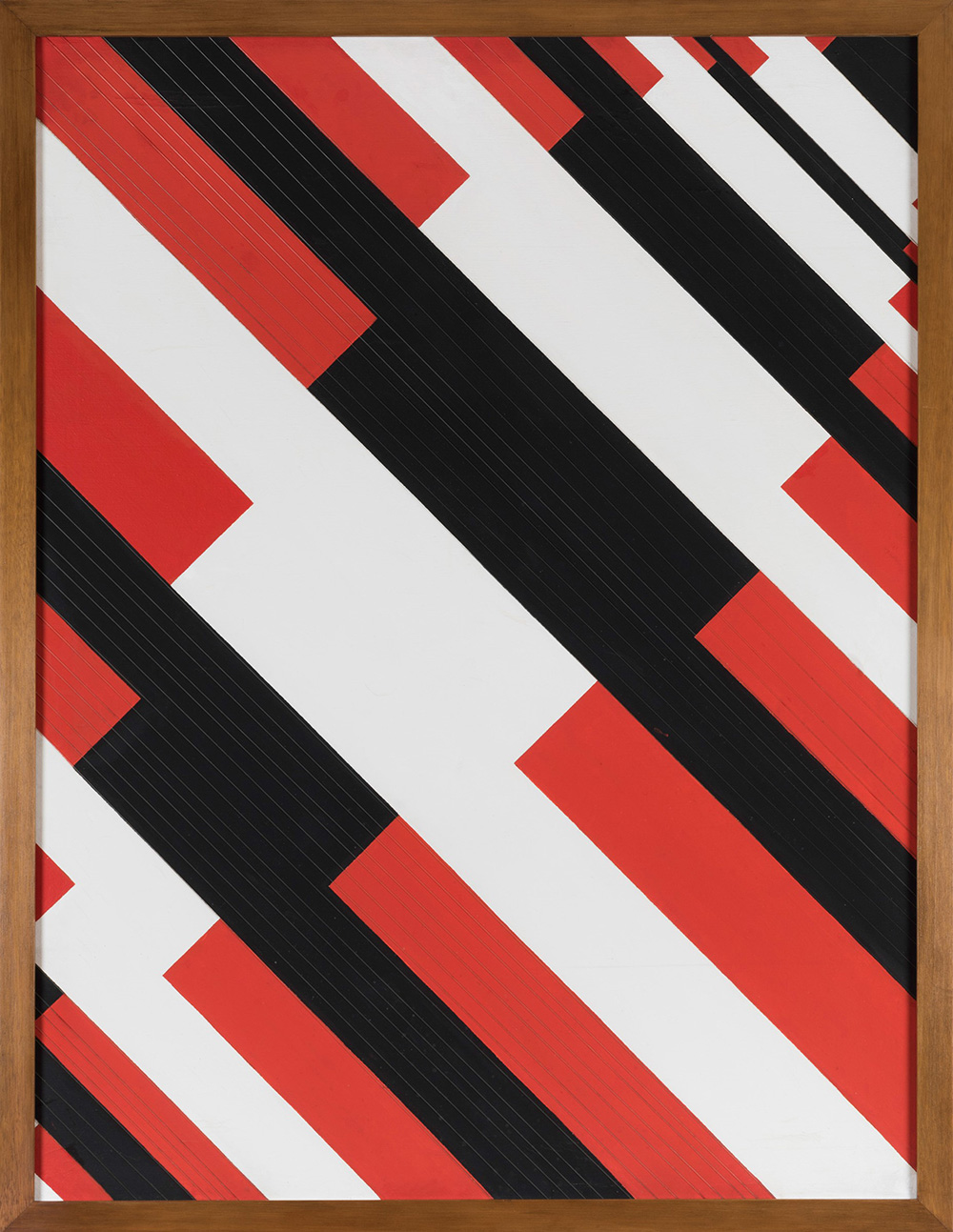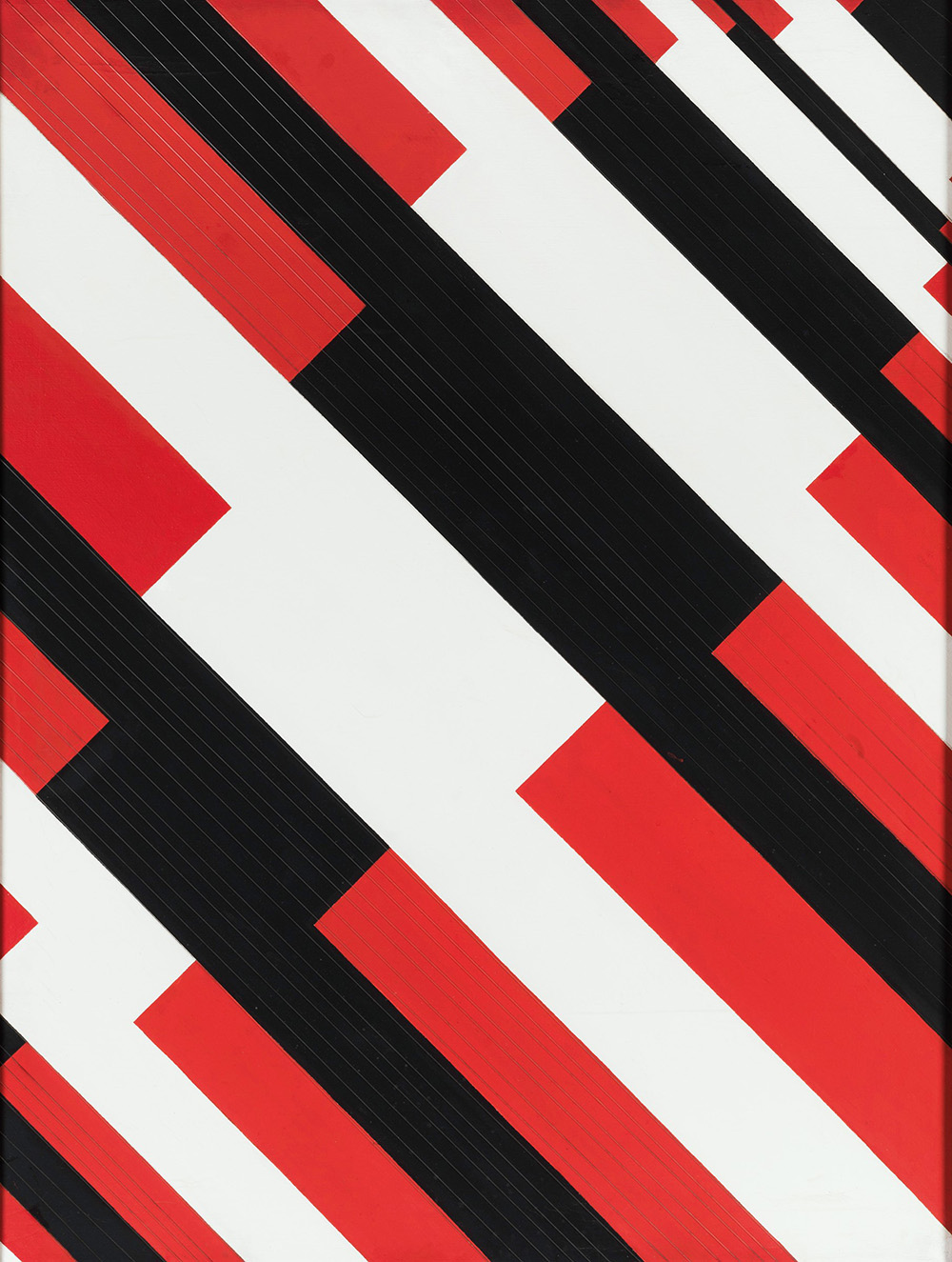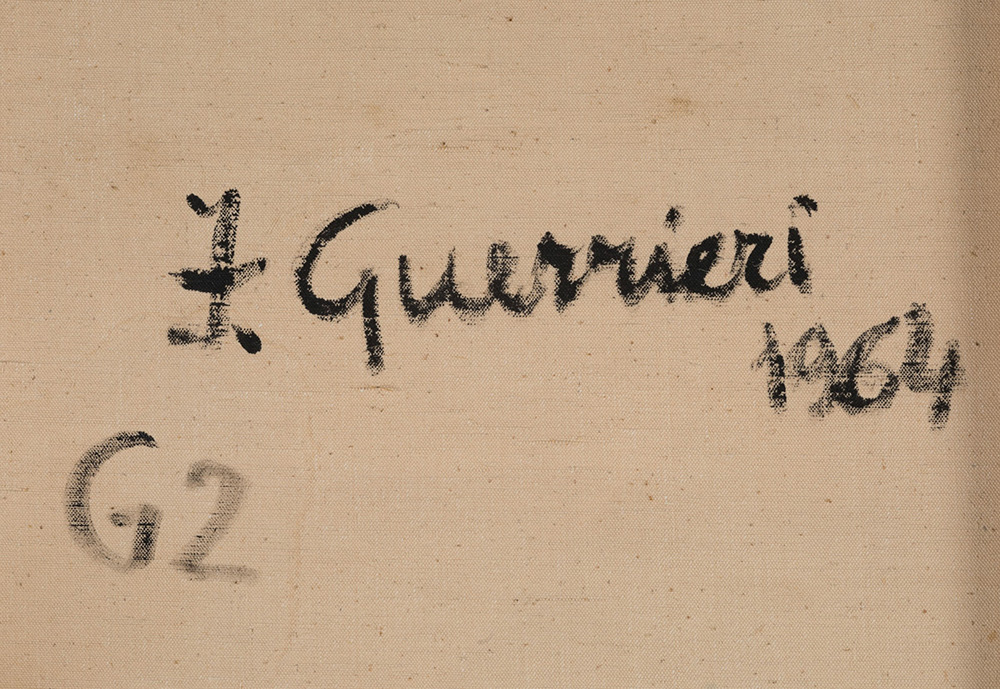 Francesco Guerrieri (1931-2015), Ritmo G2, 1964 acrilico e fili di nylon tesi su tela, cm 130x100 firmato, intitolato e datato al retro; Etichetta al retro dello Valmore Studio d’arte, Vicenza; Timbro al retro dello Studio dell’artista Provenienza:; Studio d'Arte Valmore, Vicenza; MART, Museo d'arte Moderna e Contemporanea di Trento e Rovereto; Collezione VAF Stiftung, Francoforte sul Meno; Collezione Volker Feierabend, Milano Esposizioni: Sperimentale p., Lia Drei e Francesco Guerrieri. Manifesto, catalogo della mostra (Firenze, Galleria Aquilone, 1964), Galleria Aquilone, Firenze 1964; XV premio Avezzano. "Strutture di visione", a cura di G. Tempesti, I. Tomassoni, catalogo della mostra (Avezzano, Palazzo Torlonia, agosto 1964), Edizioni dell'Ateneo, Avezzano 1964, p. 151; Sperimentale p., Lia Drei e Francesco Guerrieri, catalogo della mostra (Torino, Studio di Informazione Estetica, 1966) 1966; Francesco Guerrieri, a cura di U. Apollonio, catalogo della mostra (Venezia, Galleria Il Canale, 1968), Venezia 1968; Francesco Guerrieri, catalogo della mostra (Bergamo, Galleria Studio 2B, 1968) 1968; Francesco Guerrieri, catalogo della mostra (Napoli, Galleria Il Diagramma 32, 1975) 1975; Francesco Guerrieri, opere 1962-1974, testo di F. Menna, catalogo della mostra (Bergamo, Galleria Fumagalli, 1975), Galleria Fumagalli, Bergamo 1975, p. 13; Lo "Sperimentale p.". Lia Drei e Francesco Guerrieri, testo di E. Maurizi, catalogo della mostra (Macerata, Pinacoteca e Musei Comunali, Chiesa Monumentale di San Paolo, ottobre 1981), Coopedit Macerata, Macerata 1981, n. 22, p. 26 (ripr.); Francesco Guerrieri, Il quadro pensiero, opere 1962-1968, a cura di M. Riposati, M. Iannelli, catalogo della mostra (Roma, Galleria Monogramma Arte contemporanea, 25 febbraio - 22 marzo 2000), Monogramma arte contemporanea, Roma 2000; Francesco Guerrieri, catalogo della mostra (Taverna, Museo Civico di Taverna, 2002) 2002; Sperimentale p., Lia Drei e Francesco Guerrieri, 1963-1968, testo di L. Marziano, C. Folcarelli, catalogo della mostra (Roma, Galleria Monogramma, 2007; Viterbo, Galleria Miralli, Palazzo Chigi, 14 ottobre - 10 novembre 2007), Monogramma Arte Contemporanea, Roma 2007, pp. 14-15 (ripr.); Art Verona 09, Valmore studio d'arte (Verona, 2009) 2009; La magnifica ossessione, a cura di N. Boschiero, V. Caciollli, D. Dogheria, D.Ferrari, M. Mariech, P. Pettenella, A. Tiddia, D. Viva, Rovereto, MART, Museo di Arte Moderna e Contemporanea di Trento e Rovereto, Rovereto, 26 ottobre 2012-16 febbraio 2014 Bibliografia: F. Guerrieri, R. Assunto, Ricerche strutturali, Silva, Genova - Roma, 1969, p. 29; F. Guerrieri, Carta di identità di Francesco Guerrieri, Roma, 1973, p. 30; A. Calabrese, Francesco Guerrieri, dalla ragione alla poesia, in "Documenti oggi", II, n.1, Napoli 1976, p. 26; G.C. Argan, M. Grande, F. Menna, A. Spatola, M. Torrente, Francesco Guerrieri, Volume primo, 1960-1980, Le Vigne Nuove, Roma, 1994, p. 62; E. Zucchini, Sperimentale p., Lia Drei e Francesco Guerrieri, 1963-68, in ""Arte Contemporanea", II, n. 9, novembre-dicembre", Grottaferrata (Roma) 2007, p. 62; L. Marziano, Sperimentale p., Lia Drei e Francesco Guerrieri 1963-1968, in "Archivio delle Arti, XIX, n. 3, marzo", Mantova 2007, p. 4; C. Folcarelli, Storia dello Sperimentale p., Lia Drei e Francesco Guerrieri, in "Art&tra", aprile-maggio, Roma 2007, p. 115;