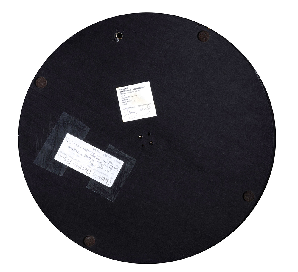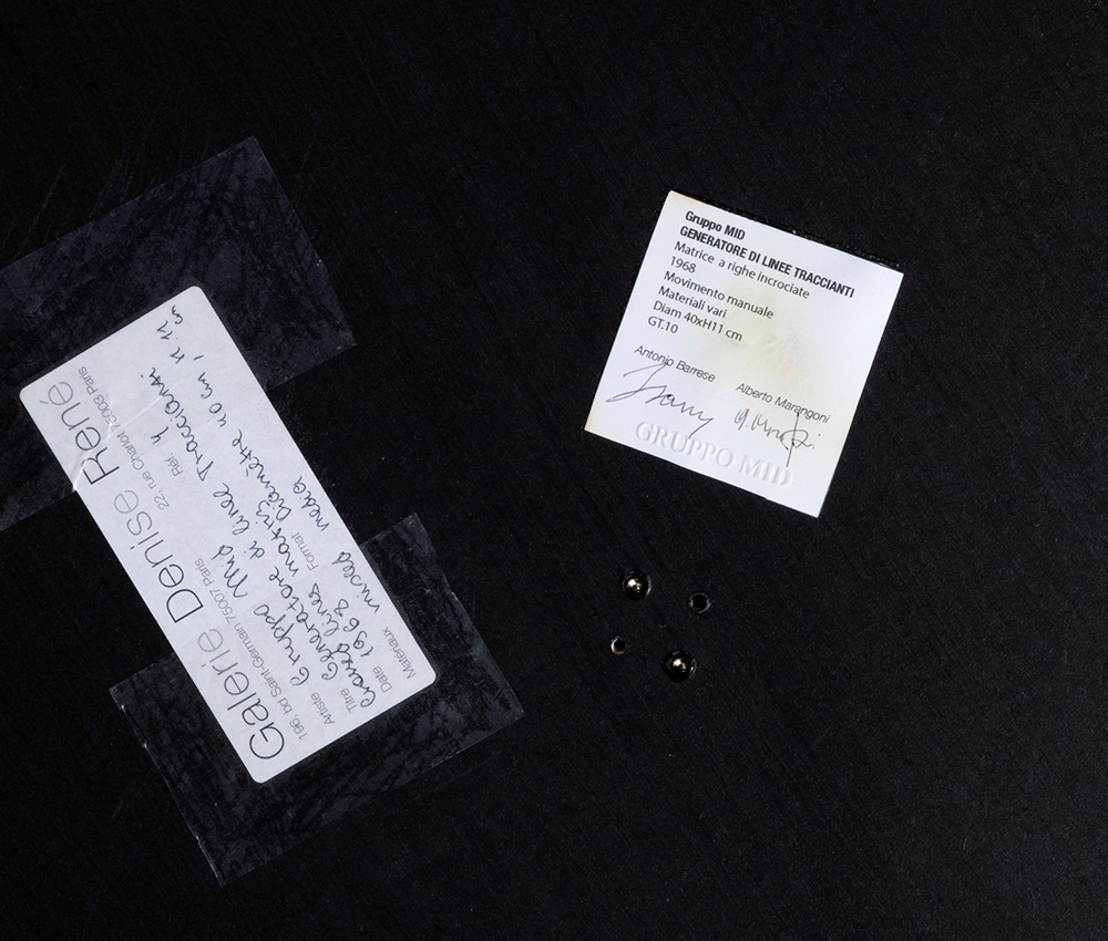 Gruppo MID, Generatore di linee traccianti GT.10, 1968 Matrice a righe incrociate movimento manuale, materiali vari, cm 40x11 Etichetta al retro del Gruppo MID con le firme degli artisti Etichetta al retro della Galerie Denise René, Parigi Autentica dell'Archivio Gruppo Mid a cura di Antonio Barrese e Alberto Marangoni