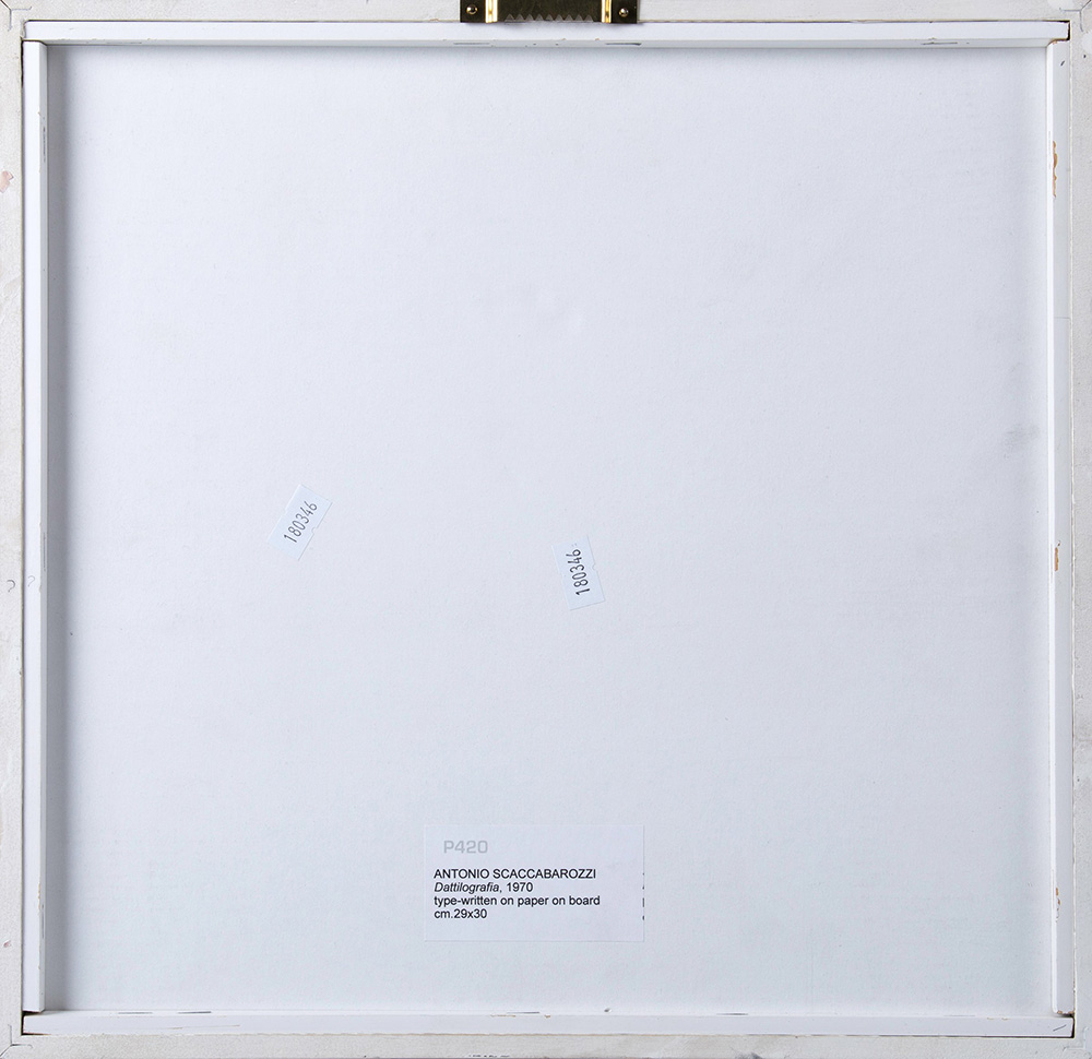 Antonio Scaccabarozzi (1936), Dattilografia, 1970 type-written su carta su tavola, cm 29x30 Etichetta al retro della Galleria P420, Bologna Provenienza: Galleria P420, Bologna Collezione privata, Milano sul bordo di destra è presente una piega