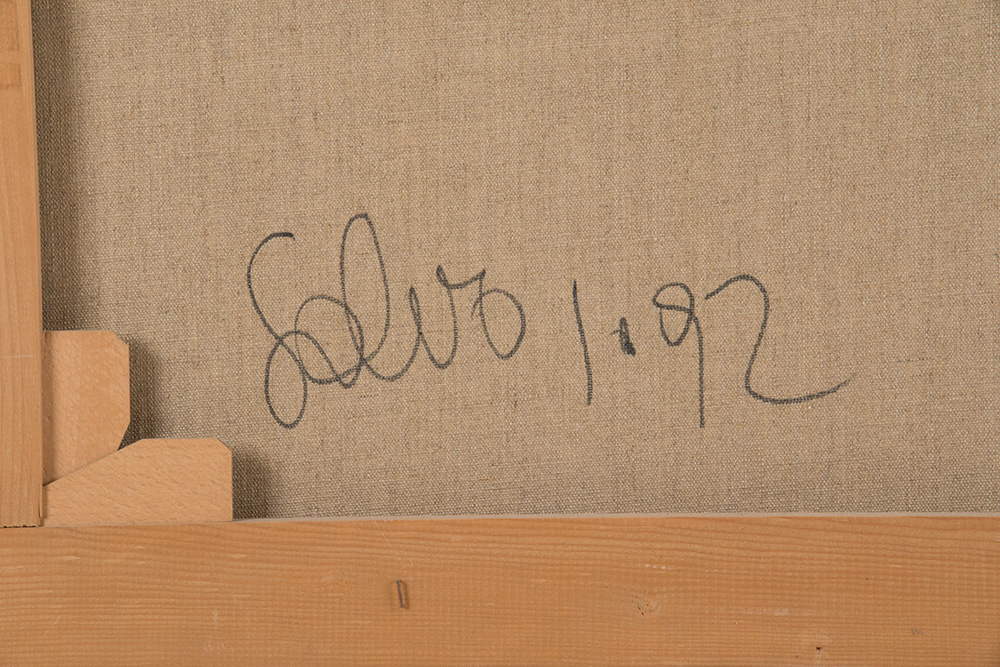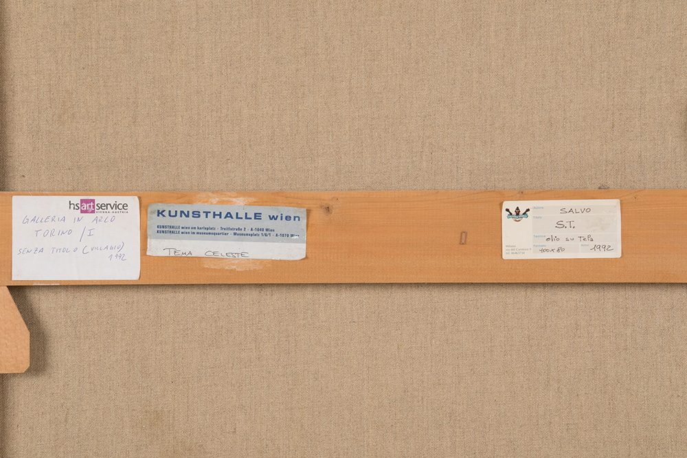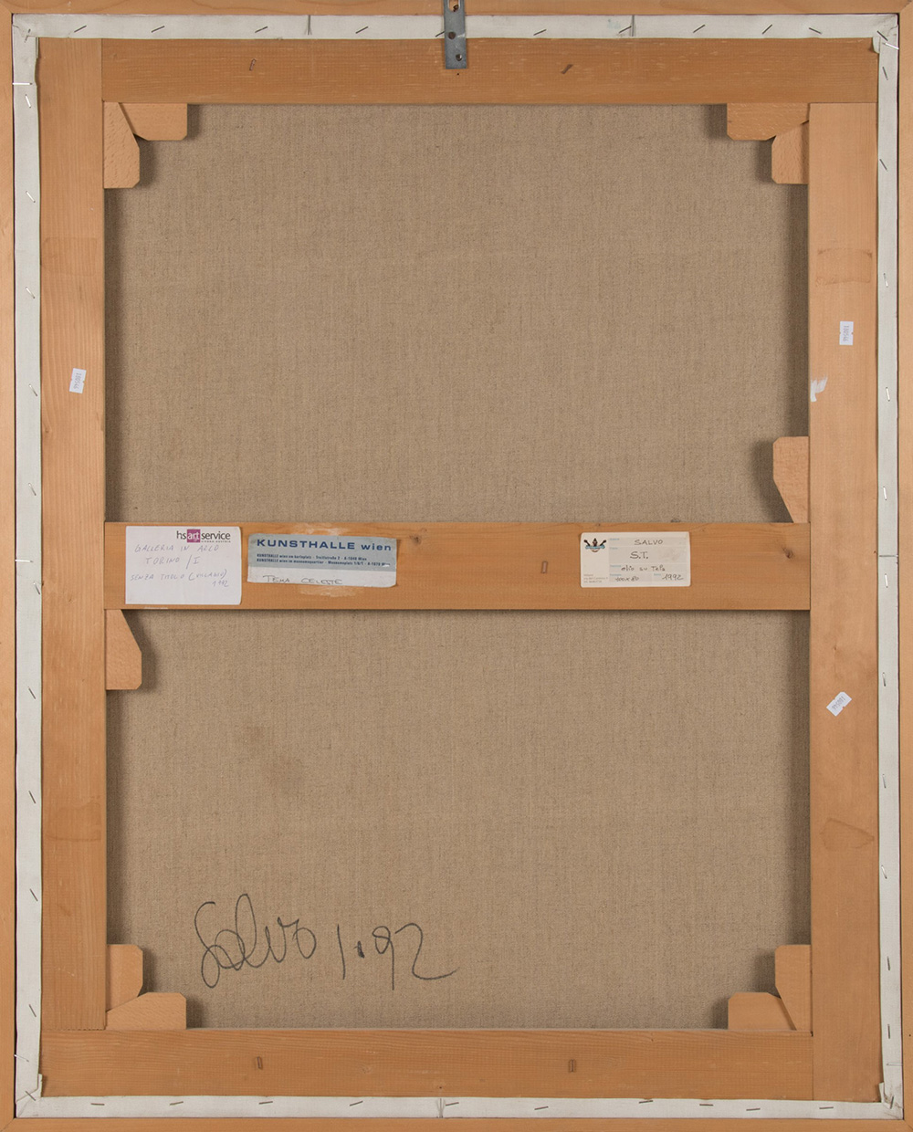 Salvo (1947-2015), Senza titolo, 1992 olio su tela, cm 100x80 firmato e datato al retro Etichetta al retro della Galleria In Arco, Torino Etichetta al retro della Galleria Toselli, Milano Autentica su fotografia dell’artista Opera registrata presso l’Archivio Salvo, Torino, con il n. S1992-14 Provenienza: Galleria In Arco, Torino, ivi acquistato dall’attuale proprietario Esposizioni: Kunsthalle Wien L’opera si presenta in buono stato conservativo