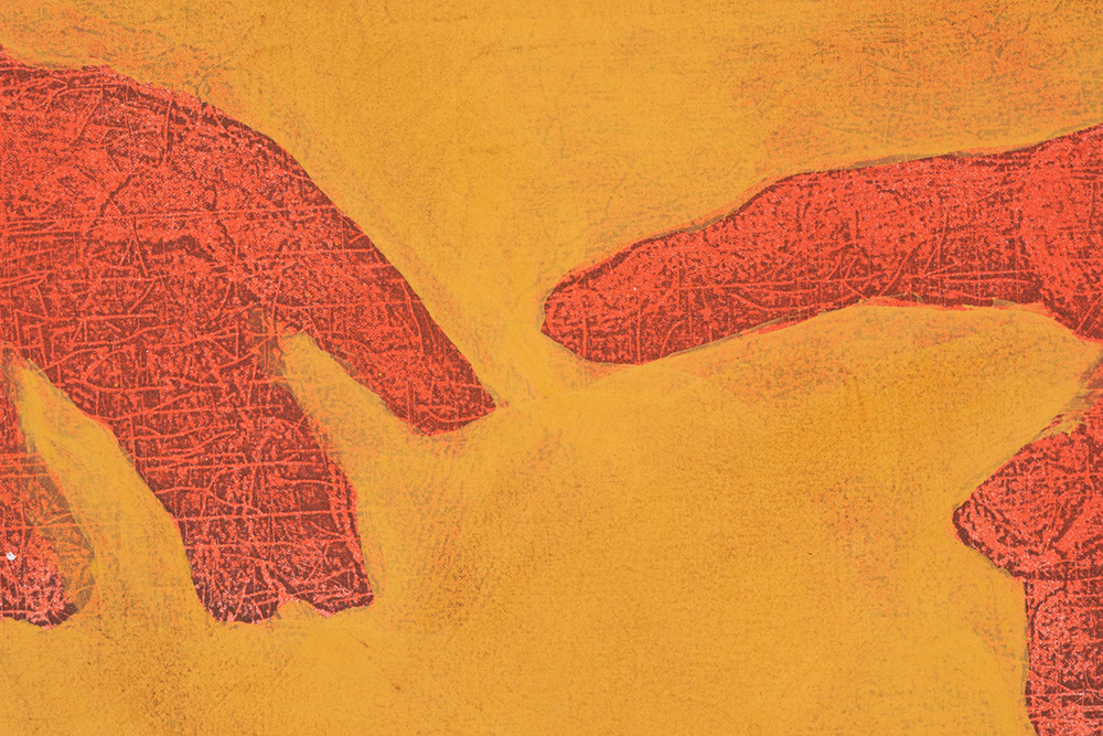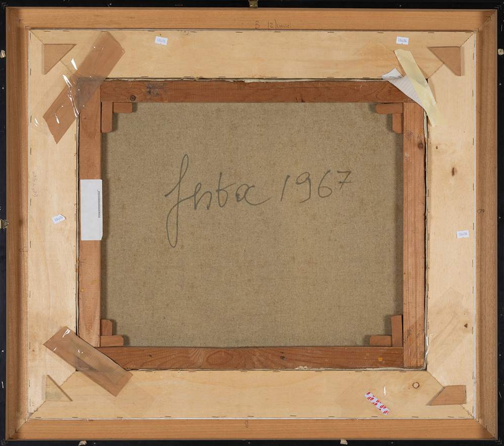 Tano Festa (1938-1988), Da Michelangelo, 1967 riporto fotografico su tela, cm 50x59 firmato e datato al retro Opera registrata presso lo Studio Soligo, Roma, con il n. 67505900264 L’opera presenta piccole mancanze di colore nella parte di sinistra, piccola introflessione con strappo della carta sopra la mano sinistra, la tela ha una patina di sporco sulla superficie