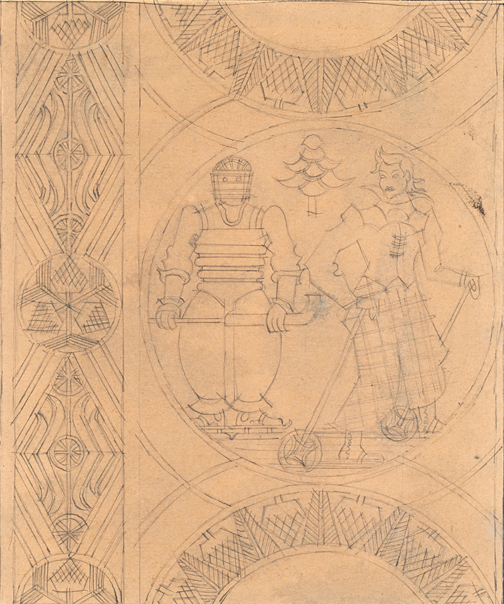 Fortunato Depero (1892-1960), Studio per la parte sinistra dell'arazzo "Sport alpestri", 1941, matita su carta, cm 19,5x16,5 Rovereto, Galleria Paganini; Merano, collezione Luigi Serravalli; Merano, collezione eredi Serravalli.