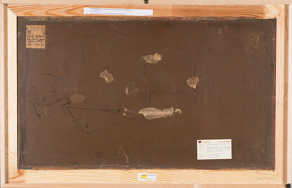 Giuseppe Santomaso (1907-1990), Natura morta con fanale, chiave e bottiglie, 1941, olio su tavola, cm 47x78 Firmato e datato in basso a destra: Santomaso 41 Milano, Galleria Della Spiga (etichetta e timbro al verso); collezione privata. Viterbo, Fondazione Carivit, Tra forma e segno 1915 - 2015. Dipinti da due inedite collezioni d'arte, 19 marzo-29 maggio 2016. Tra forma e segno 1915 - 2015. Dipinti da due inedite collezioni d'arte, catalogo della mostra, RealizzArte SAS, Rimini 2016, p. 31 (riprodotto).